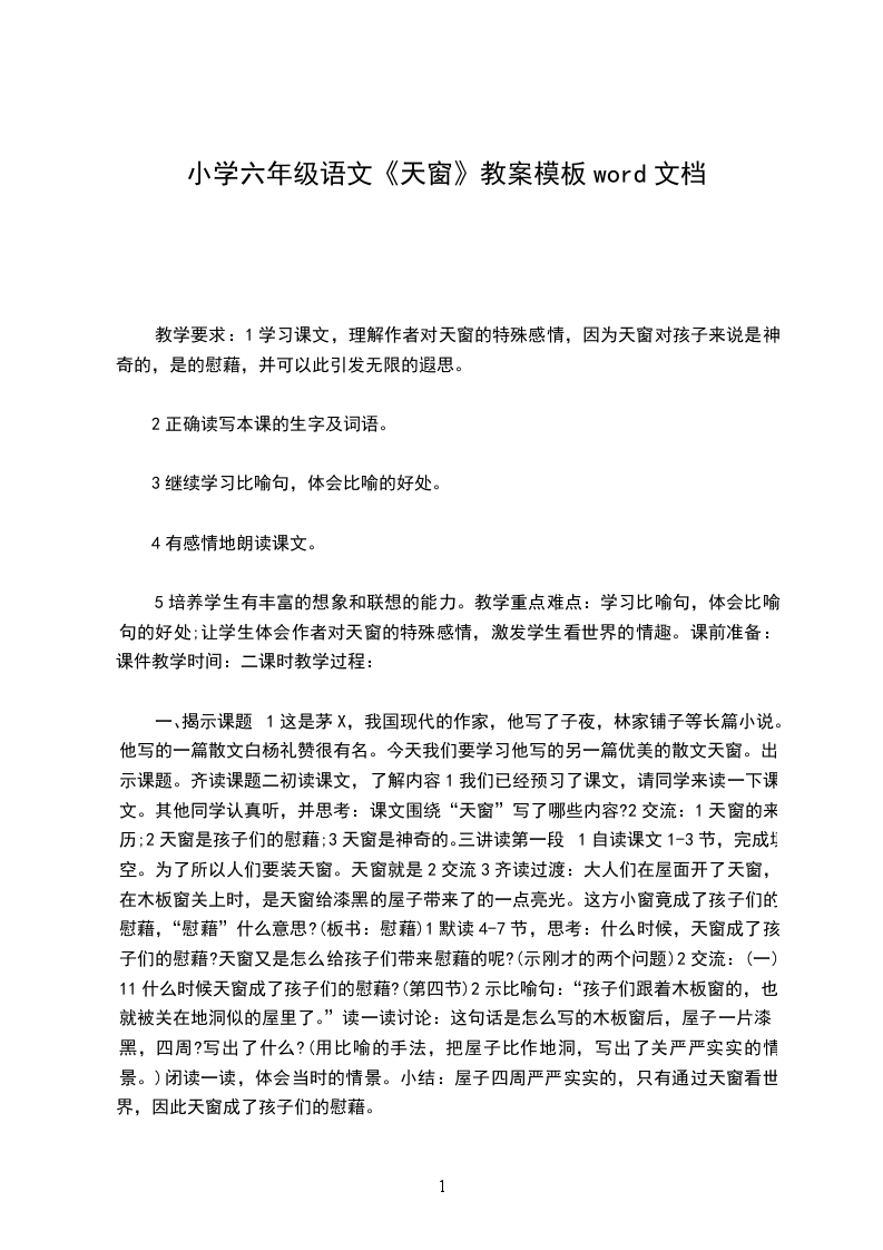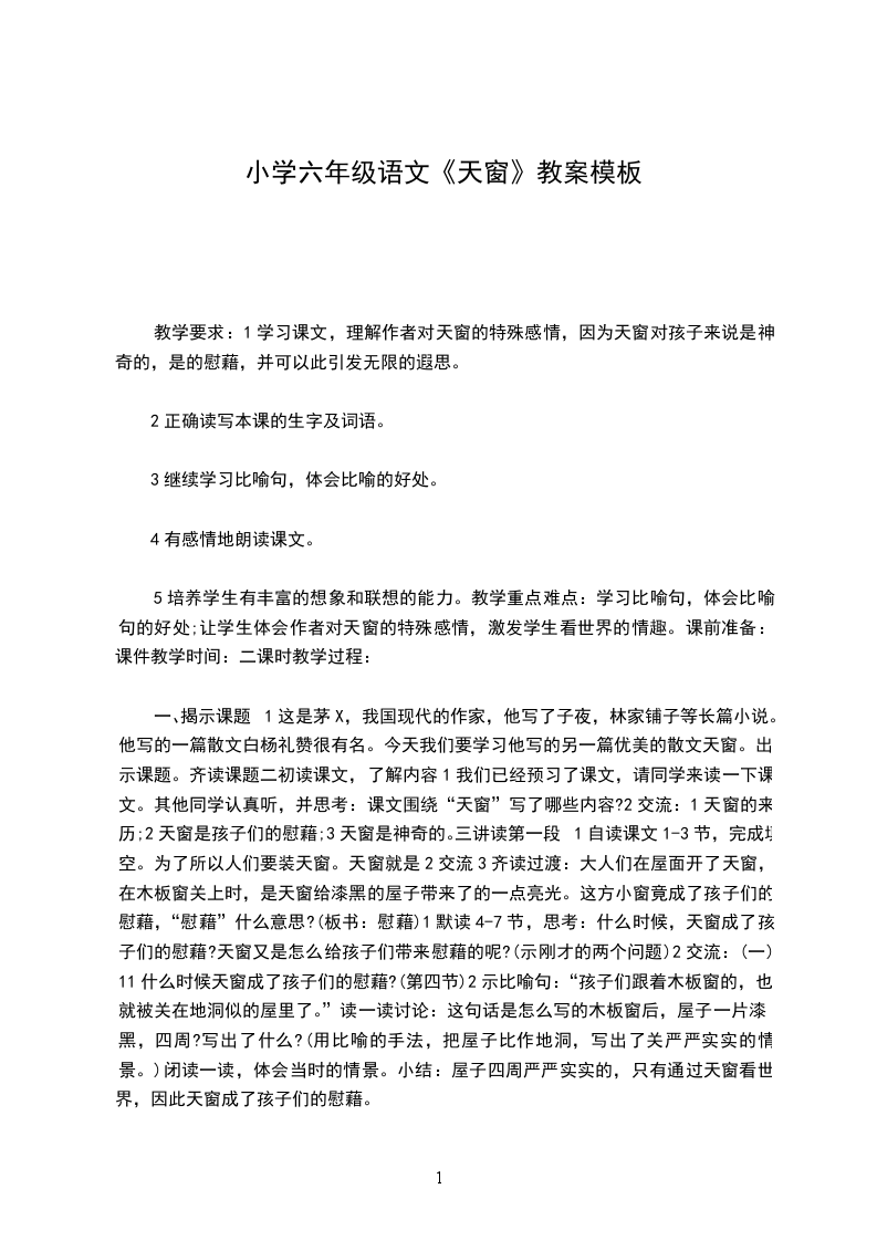 一、导入每栋房子都离不开窗,可是在许多年前的中国南方农村,窗是怎样的呢?(出示图片)乡下的房子只有前面一排木板窗。暖和的晴天,木板窗怎样?(学生齐声回答:木板窗扇扇打开,光线和空气就都有了。)碰着大风大雨,或者北风呼呼叫的冬天,木板窗又会怎样?(学生齐声回答:木板窗只好关起来,屋子就黑得像地洞似的。)是乡下人在屋顶上面开一个小方洞,装一块玻璃,叫做天窗。出示:天窗这样一扇简陋的,只能透些阳光和空气的天窗究竟有什么魅力吸引茅X先生写下这篇文章呢?这小小的一方空白又对活泼好想的孩子们意味着什么呢?请同学们自由朗读课文。要求:读准字音,读通语句。