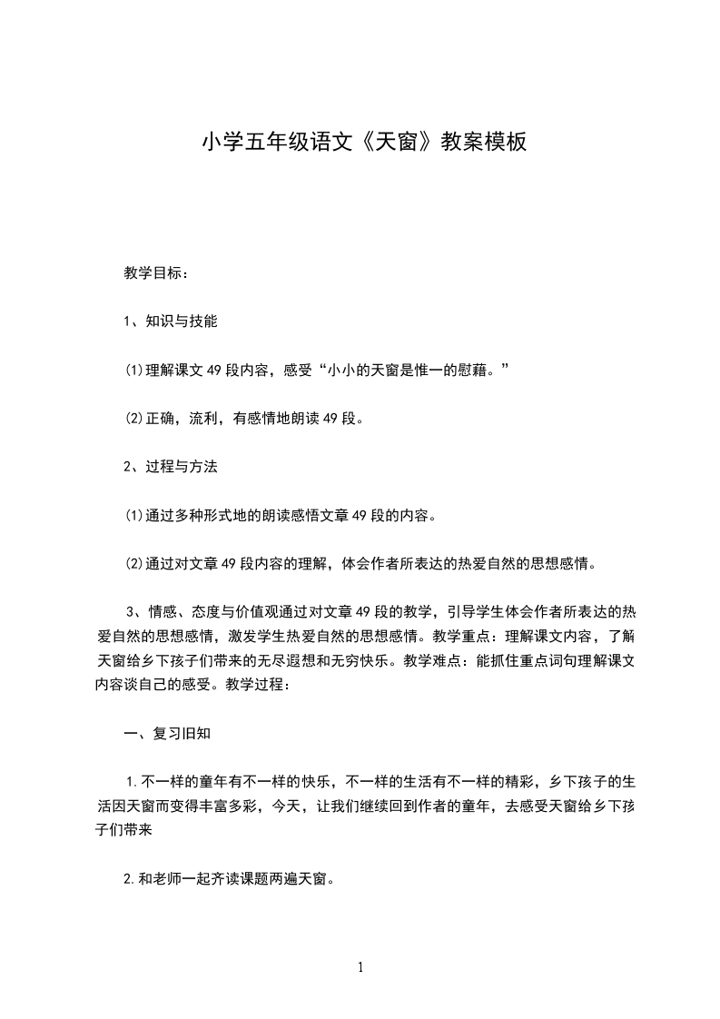 3、情感、态度与价值观通过对文章49段的教学,引导学生体会作者所表达的热爱自然的思想感情,激发学生热爱自然的思想感情。教学重点:理解课文内容,了解天窗给乡下孩子们带来的无尽遐想和无穷快乐。教学难点:能抓住重点词句理解课文内容谈自己的感受。教学过程: