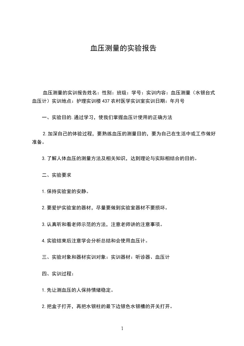 血压测量的实训报告姓名:性别:班级:学号:实训内容:血压测量(水银台式血压计)实训地点:护理实训楼437农村医学实训室实训日期:年月号