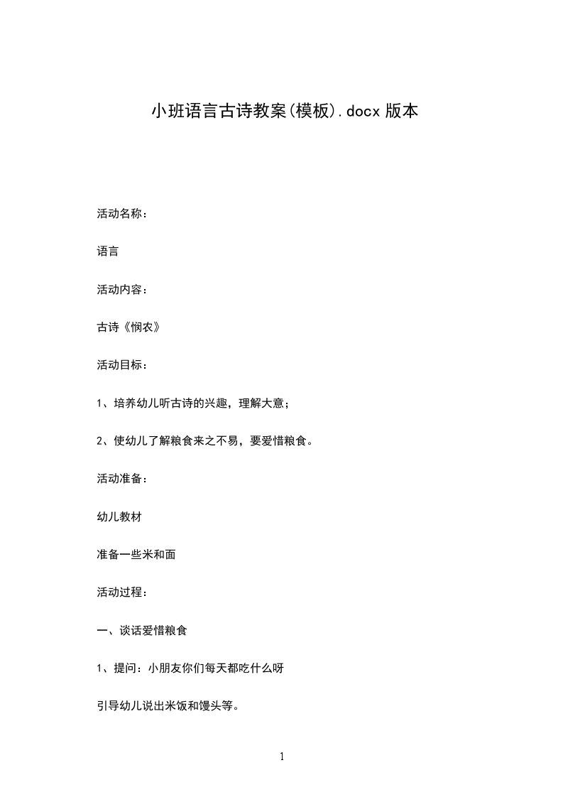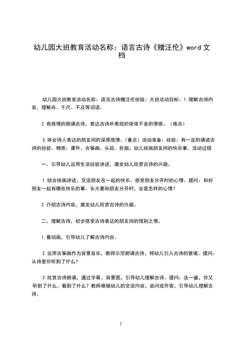 幼儿园大班教育活动名称:语言古诗赠汪伦班级:大班活动目标:1.理解古诗内容,理解舟、千尺、不及等词语。
