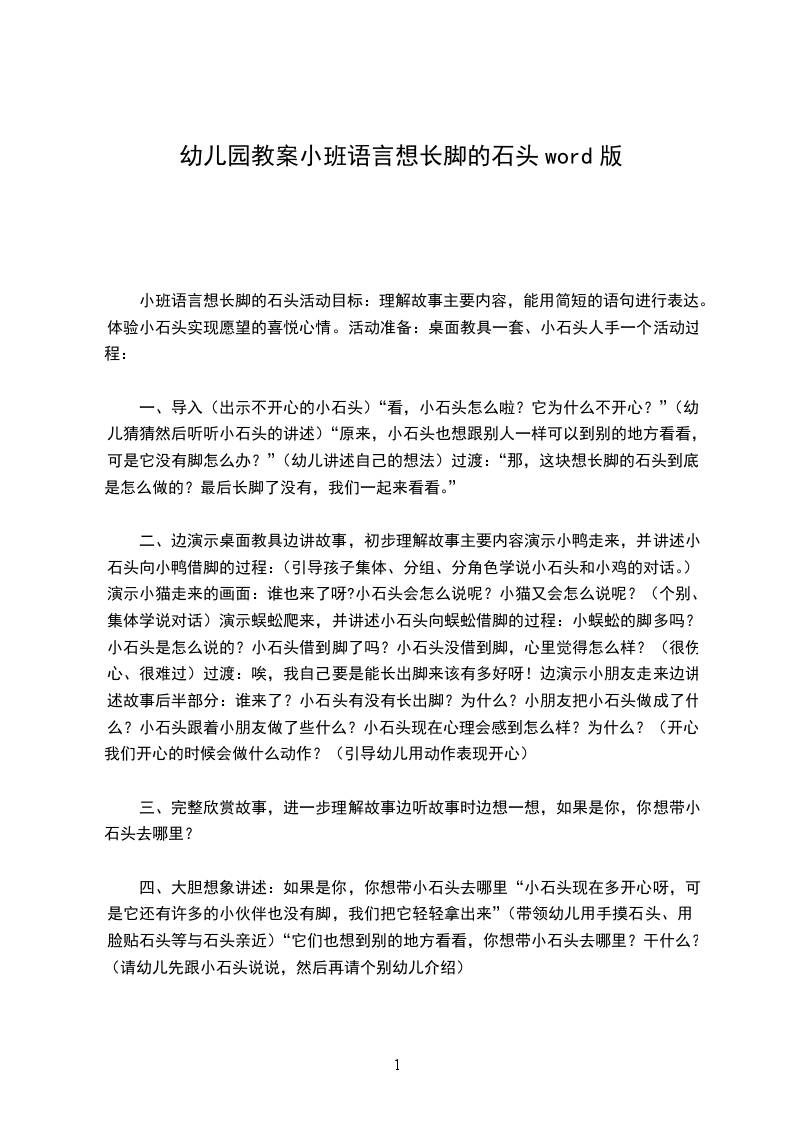 小班语言想长脚的石头活动目标:理解故事主要内容,能用简短的语句进行表达。体验小石头实现愿望的喜悦心情。活动准备:桌面教具一套、小石头人手一个活动过程: