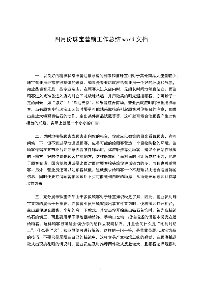 四、利用顾客所提出的质疑,尽可能抓机会介绍珠宝知识顾客所了解的珠宝知识越多,其买后感受就会得到更多的满足。当一位女士戴上新买的一枚钻戒去上班,总是希望引起同事们的注意。当别人看到这枚钻戒后,她便会把所知道的有关钻石知识滔滔不绝地讲一遍,充分得到拥有一颗钻石的精神享受,同时她也在为你做广告。常言道;“满意的顾客是最好的广告”,“影响力最强的广告是其周围的人”。但如果你不管顾客是否愿意听,不分时机的讲解珠宝知识,也会招来顾客的厌烦。因此时机很重要,在销售的整个过程中抓住机会,尤其是当顾客提出质疑时。以上是_份的工作总结,不足之处还请各位领导和同事多批评指正。