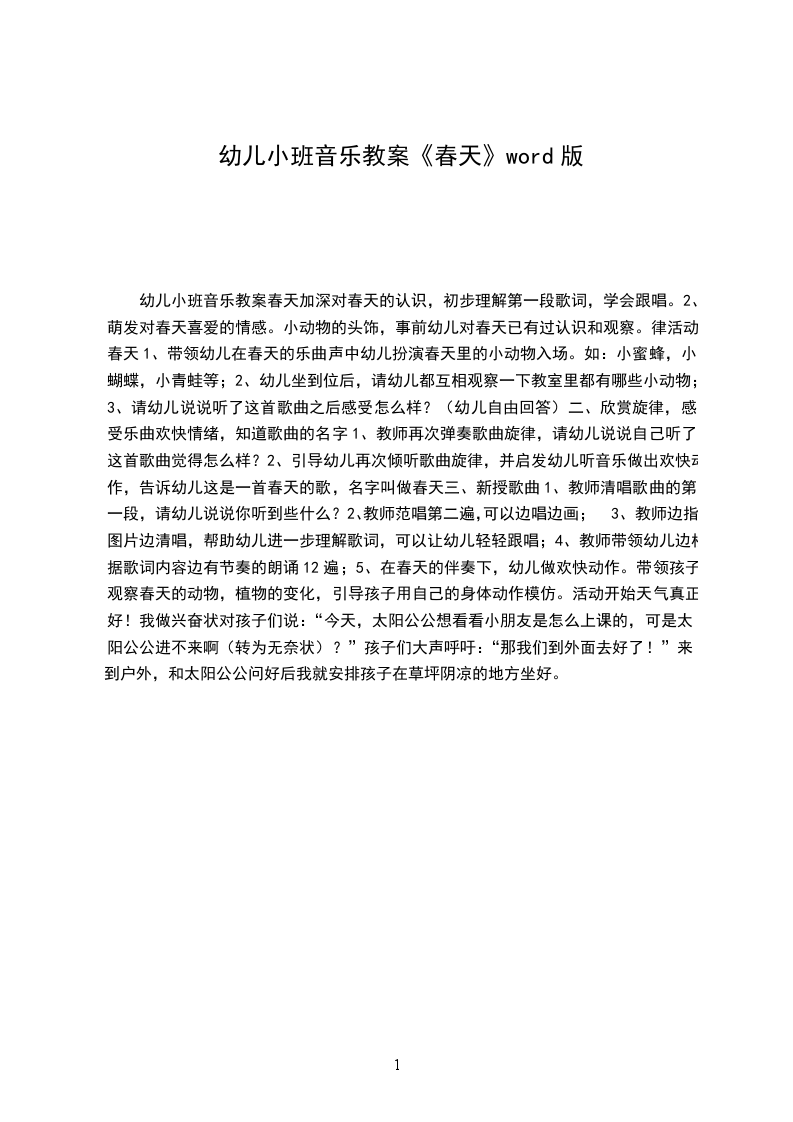 3、激发幼儿对春天的喜爱之情。活动重点:熟悉乐曲旋律,理解歌词内容,了解春天的主要特征。活动难点:激发幼儿对春天的喜爱之情。活动准备:钢琴、有关春天的图片活动过程: