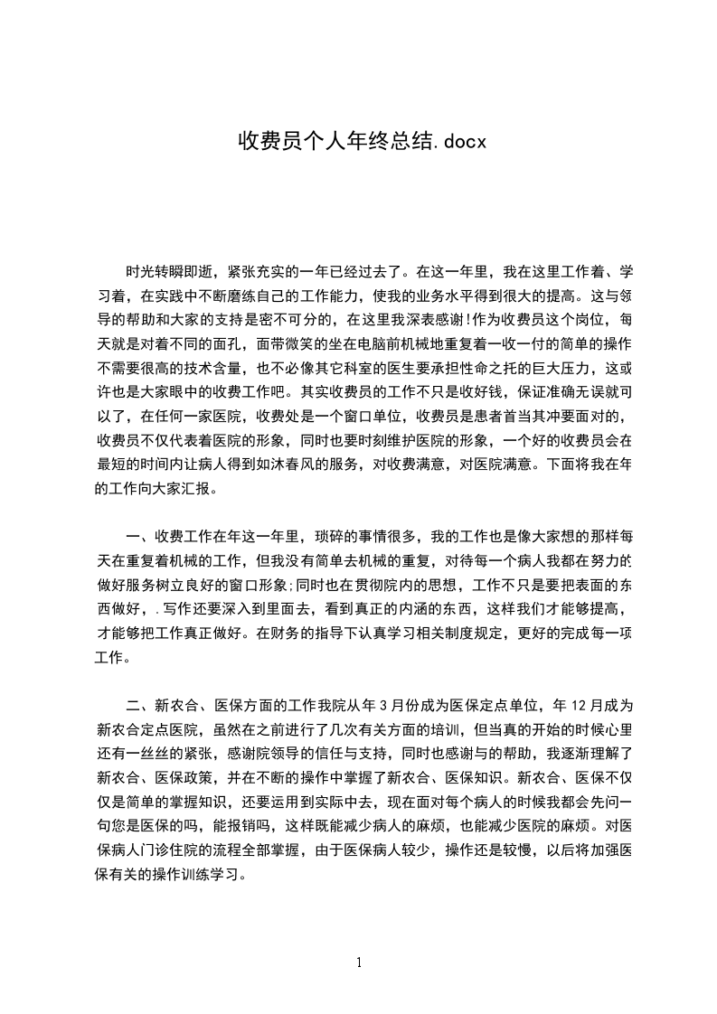 时光转瞬即逝,紧张充实的一年已经过去了。在这一年里,我在这里工作着、学习着,在实践中不断磨练自己的工作能力,使我的业务水平得到很大的提高。这与领导的帮助和大家的支持是密不可分的,在这里我深表感谢!作为收费员这个岗位,每天就是对着不同的面孔,面带微笑的坐在电脑前机械地重复着一收一付的简单的操作,不需要很高的技术含量,也不必像其它科室的医生要承担性命之托的巨大压力,这或许也是大家眼中的收费工作吧。其实收费员的工作不只是收好钱,保证准确无误就可以了,在任何一家医院,收费处是一个窗口单位,收费员是患者首当其冲要面对的,收费员不仅代表着医院的形象,同时也要时刻维护医院的形象,一个好的收费员会在最短的时间内让病人得到如沐春风的服务,对收费满意,对医院满意。下面将我在年的工作向大家汇报。