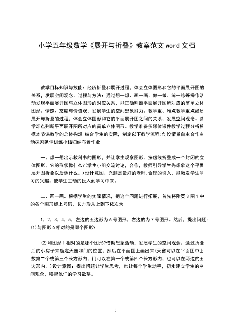 教学目标知识与技能:经历折叠和展开过程,体会立体图形和它的平面展开图的关系,发展空间观念。过程与方法:通过想一想、画一画、做一做、练一练等操作活动发现平面展开图与立体图形的对应关系,能正确判断平面展开图所对应的简单立体图形。情感、态度与价值观:发展学生的空间想象能力。教学重、难点教学重点经历展开与折叠的过程,体会立体图形和它的平面展开图之间的关系,发展空间观念。教学难点判断平面展开图所对应的简单立体图形。教学准备多媒体课件教学过程分析根据本节课教学的总体构想,结合学生的实际,制定以下教学流程:创设情景自主合作主动探索延伸训练小结归纳布置作业