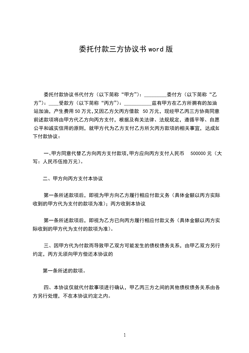 委托付款协议书代付方(以下简称“甲方”):_________委付方(以下简称“乙方”):____受款方(以下简称“丙方”):___________兹有甲方在乙方所拥有的加油站加油,产生费用50万元,又因乙方欠丙方借款50万元,现经甲乙丙三方协商同意,前述款项将由甲方代乙方向丙方支付,根据及有关法律、法规规定,遵循平等、自愿、公平和诚实信用的原则,就甲方代为乙方支付乙方所欠丙方款项的相关事宜,达成如下付款协议: