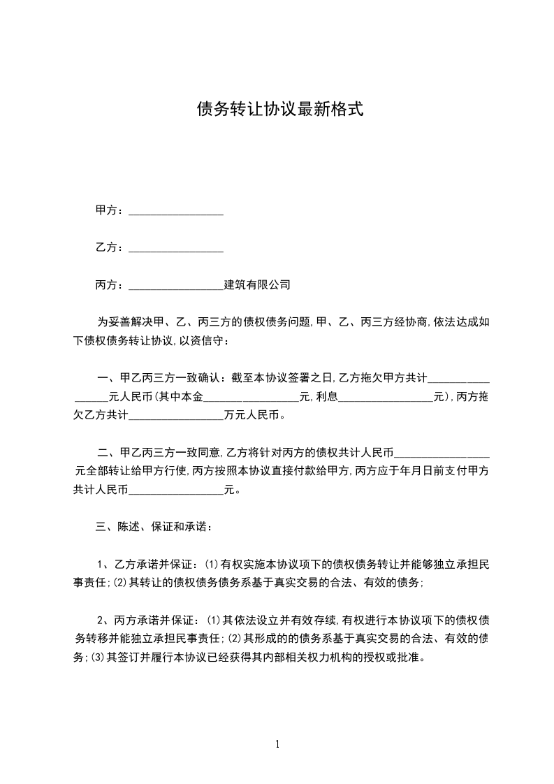 二、甲乙丙三方一致同意,乙方将针对丙方的债权共计人民币_________________元全部转让给甲方行使,丙方按照本协议直接付款给甲方,丙方应于_____年_____月_____日前支付甲方共计人民币_________________元。