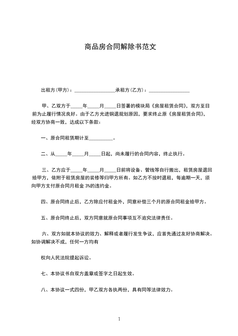 甲、乙双方于_____年_____月_____日签署的模块局《房屋租赁合同》,双方至目前为止履行情况良好。由于乙方光进铜退规划原因,要求终止原《房屋租赁合同》,经双方协商一致,达成以下条款: