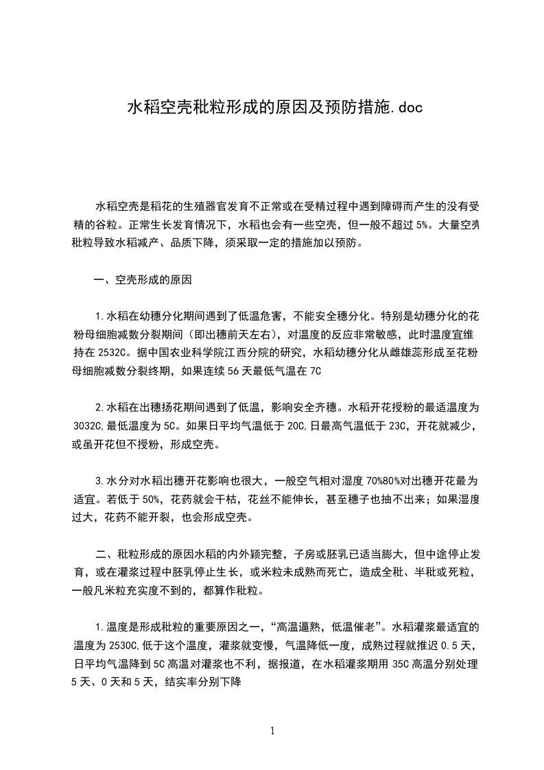 2.水稻在出穗扬花期间遇到了低温,影响安全齐穗。水稻开花授粉的最适温度为3032C,最低温度为5C。如果日平均气温低于20C,日最高气温低于23C,开花就减少,或虽开花但不授粉,形成空壳。