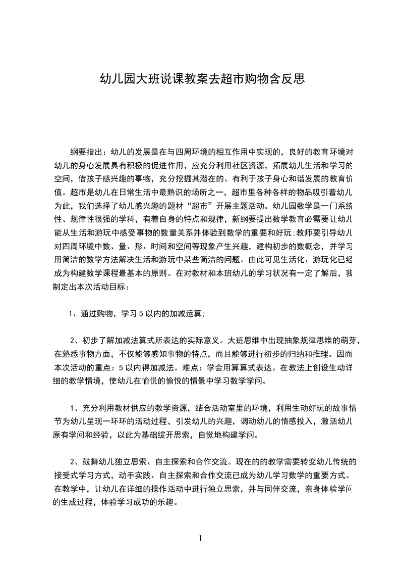 5以内的加减法这部分内容是在学生要求把握了数的分与合的基础上进行教学的,是0以内加减法的基础,是后面学习加减计算和解决实际问题的重要基础。最终,去超市购物,要求幼儿一次只能买两样,加起来不能超过5元,由于答案的多样性,好多孩子就不知道该买哪两样,也就不会列式了,主要原因是本次的操作答案多种多样对能力弱一点的孩子来说是有难度的。总之,在本次教学中,我提倡算法的多样化,为孩子供应了数学交流的机会,目的是促进孩子的数学思维活动,提高孩子的数学思维能力,由于提倡算法的多样化,不同的孩子有不同的解题策略,他们会运用自己的方法解决问题,会对解决数学问题有初步的体验,从而取得学习数学的经验,这些运算方法都是孩子依据自己有的基础学问和生活经验思索的结果,每一个不同的算法,就代表了一个创新的意识,尽管效果不是很好,但能有效地促进幼儿发散思维的能力。教学反思:通过本次教学活动,让我了解了孩子对数学都很薄弱,为了能够使他们对数学感兴趣,我预备在以后的数学活动中多加游玩,做到让幼儿在玩中乐、玩中学的目的。真正让幼儿成为学习的主人,不断提升幼儿的自主探究能力。