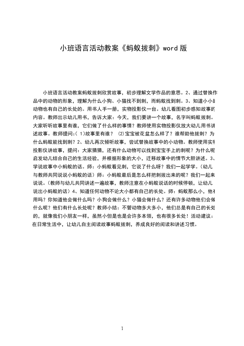 小班语言活动教案《蚂蚁拔刺》word版