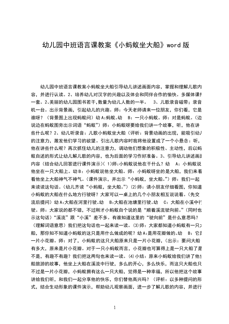 幼儿园中班语言课教案《小蚂蚁坐大船》word版