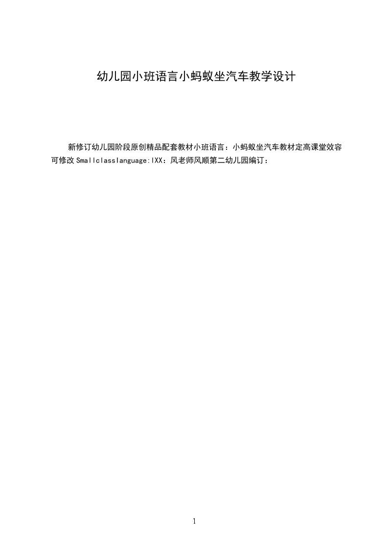 新修订幼儿园阶段原创精品配套教材小班语言:小蚂蚁坐汽车教材定高课堂效容可修改SmallclassIanguage:lXX:风老师风顺第二幼儿园编订: