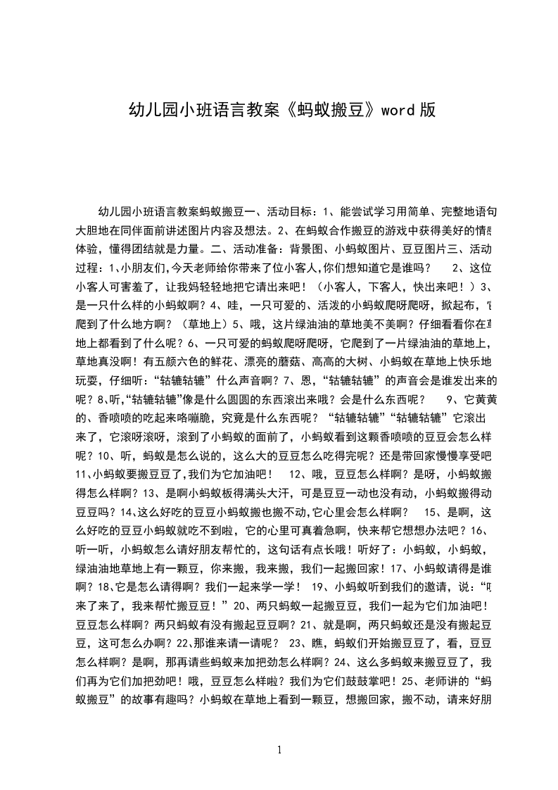 幼儿园小班语言教案《蚂蚁搬豆》word版