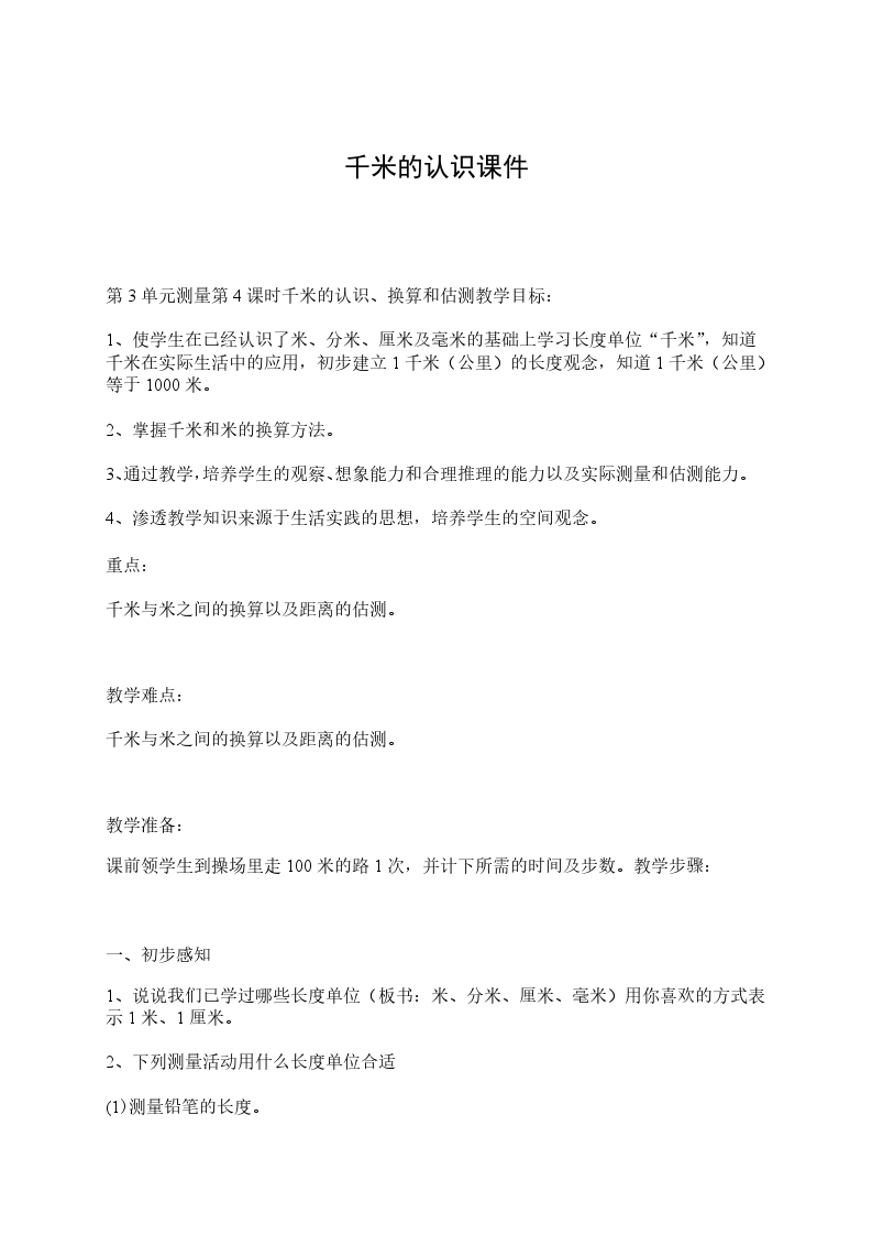 2、提高学生运用米和千米相关的知识解决实际问题的能力。教学重点:会根据千米与米之间的进率进行简单的换算。教学难点:能正确解答与“千米”相关的实际问题教学准备:多媒体课件。