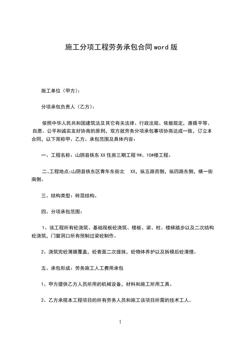 依照中华人民共和国建筑法及其它有关法律、行政法规、依据规定,遵循平等、自愿、公平和诚实友好协商的原则,双方就劳务分项承包事项协商达成一致,订立本合同,以下简称甲、乙方。承包范围及具体内容: