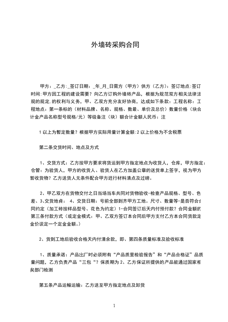 甲方:_乙方:_签订日期:_年_月_日需方(甲方)供方(乙方):签订地点:签订时间:甲方因工程的建设需要?向乙方订购外墙砖产品,根据中华人民共和国民法典及为规范双方相关法律法规的规定,的权利与义务,甲、乙双方充分友好协商,达成如下条款:工程名称:工程地点:
