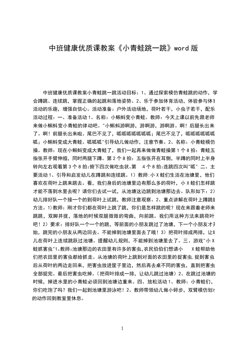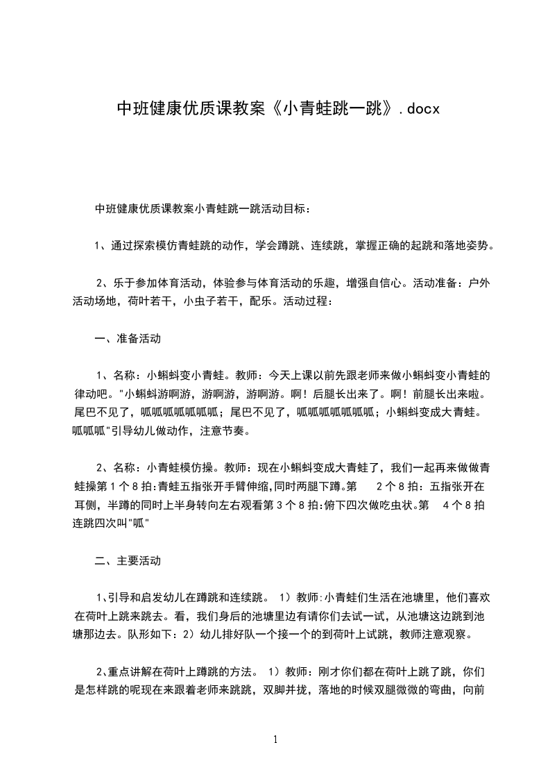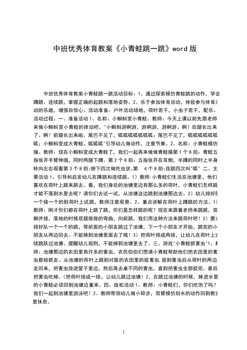 2、在活动中萌发喜爱和保护青蛙的情感。活动准备:活动场地。活动过程: