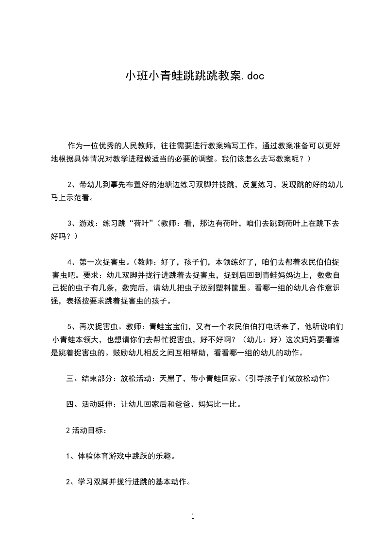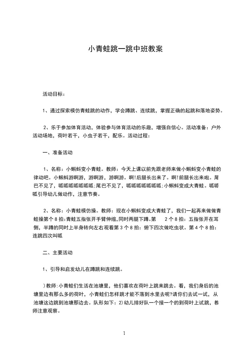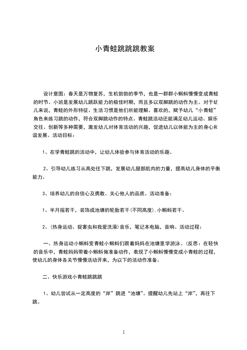 4、放松活动。活动反思:本次活动以运动为载体,通过创设简单的游戏情景、使幼儿主动参与活动,体验运动的快乐。活动一开始,带领幼儿随着音乐走成一个大圆模仿小动物走、跳等动作,在引导幼儿进行队形队列练习,接着引导幼儿随音乐做小青蛙操。活动的基本部分,我设计了模仿小青蛙动作、学习蹲撑跳为主要环节。在活动的结束部分,引到幼儿跟着老师进行简单的放松活动。整个活动力求在师幼间的积极互动中让孩子在轻松、愉悦的氛围中自然而然地学习蹲跳,并学习双脚并拢地朝前跳,训练肌肉的耐力。