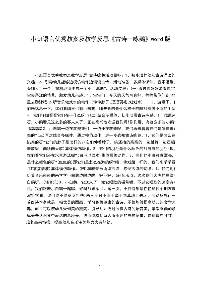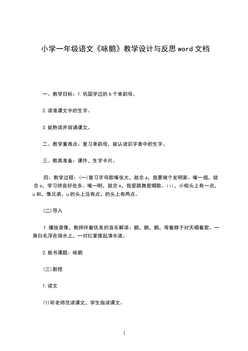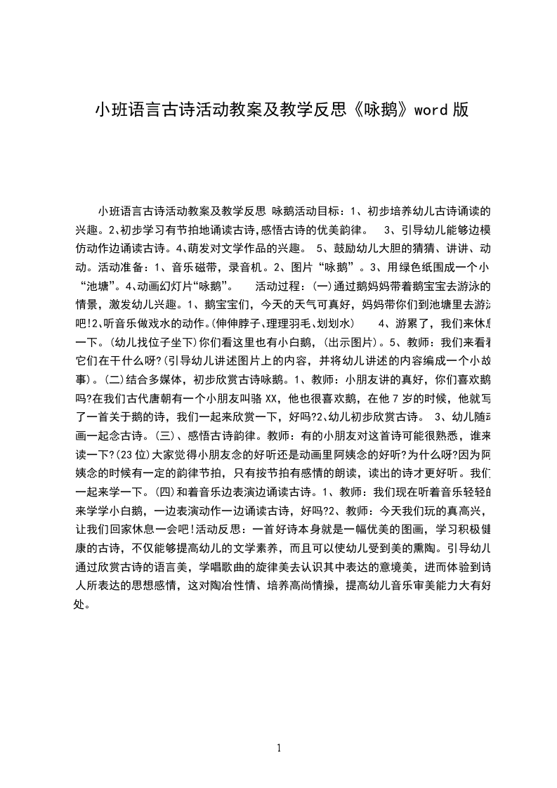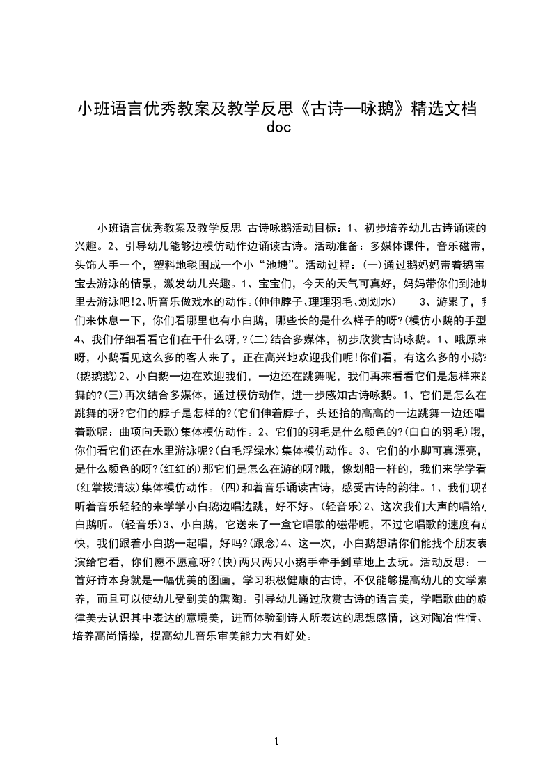 2.小合作:表现诗歌,方式自定。可以朗诵;可以绘画;也可以根据自己的理解和想象跳舞表现诗歌的意境。咏是一首深受学生喜的唐诗,中的小白形象生,情境的描述虽然廖X几笔,但富有情趣,想像的空间很大;歌曲的旋律天真活泼、简单易学。词曲合在一起,展在我面前的是一幅有声有色的画面。教学篇文之前,我事先在班上了解到:不少学生已会背这首诗了,所以本课教学我把重点放在:引导学生有感情地朗读,略诗的意境,认识生字和会写四会字。读时,我放手让学生自读,接着同桌互读(会的教不会读会读的比比谁读得最有感情)、指名、听音乐读在多种方式的读中感悟诗意,而没有作过多的讲解,“百遍,其义自”。特是学生加入自己喜的作读,形象地再了情诗景,在中可以深深感受到学生对大白的喜爱之情,并渗透了人与物关系密不可分、亲切自然的教育。关于的句:题鹅【唐】李商隐眠沙卧水自成群,曲岸残阳极浦云。那解将心怜孔翠,羁雌共故雄分。舟前小鹅儿【唐】杜甫儿黄似酒,酒爱新。引颈嗔船逼,无行乱眼多。翅开遭宿雨,力小困沧波。客散城暮,狐狸奈若何。得房公池鹅【唐】杜甫房相西亭一群,眠沙泛浦白云。凰池上回首,为报笼随王右。鹅儿【唐】李XX后闲行村舍边,黄鹅清水真可怜。何穷散乱随新草,永日淹留在野田。无事群鸣遮水际,争来引颈逼人前。风吹楚泽蒹葭暮,看下寒溪逐去船。道州北池放鹅【唐】吕温我非好鹅癖,尔乏鸣雁姿。安得免沸鼎,澹然游清池。见生不忍食,深情固在斯。能自远飞去,无念稻粱为。咏鹅【唐】骆宾王鹅鹅鹅,曲项向天歌。白毛浮绿水,红掌拨清波。鹅赠鹤【唐】白居易君因风送入青云,我被人驱向鸭群。雪颈霜毛红网掌,请看何处不如君?鹤答鹅【唐】白居易右军殁后欲何依,只合随鸡逐鸭飞。未必牺牲及吾辈,大都我瘦胜君肥。