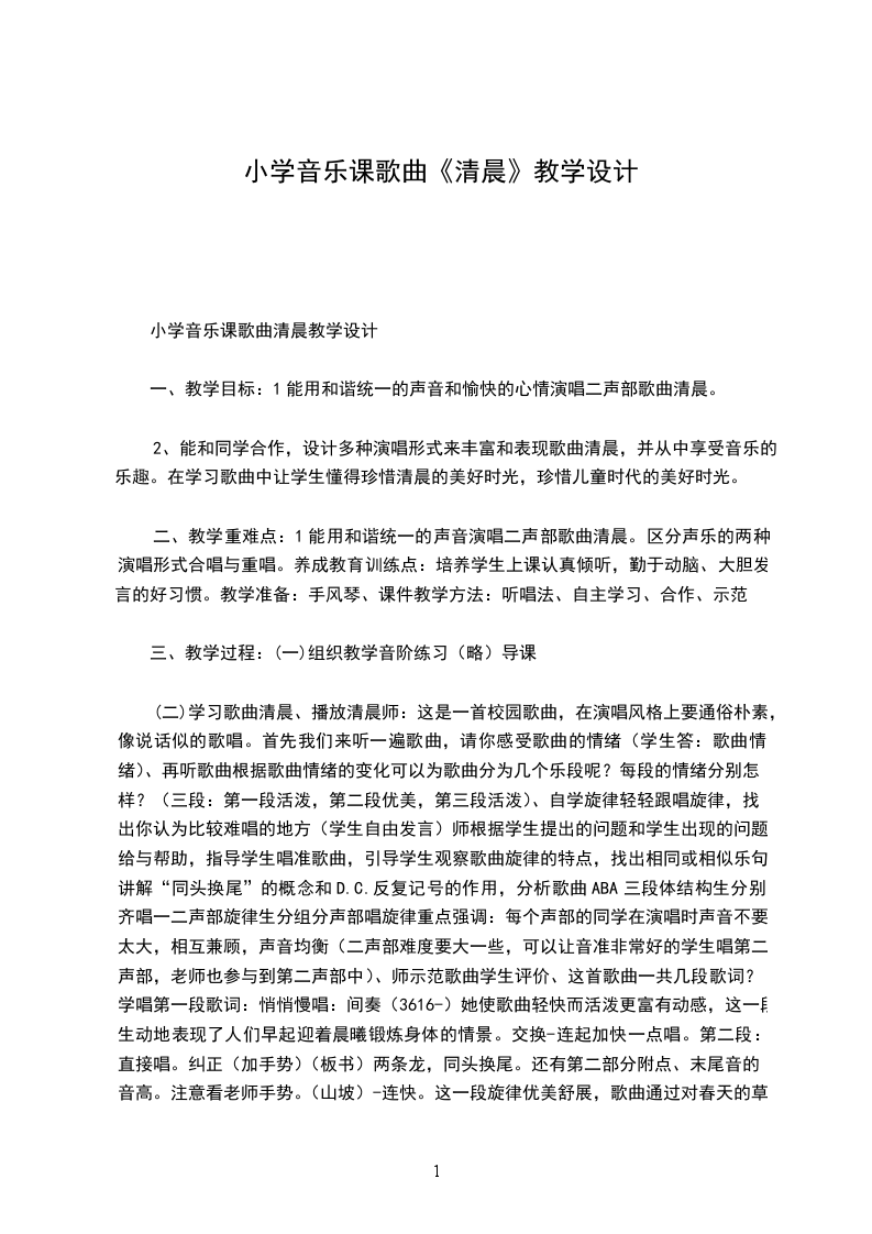 一、教学目标:1能用和谐统一的声音和愉快的心情演唱二声部歌曲清晨。