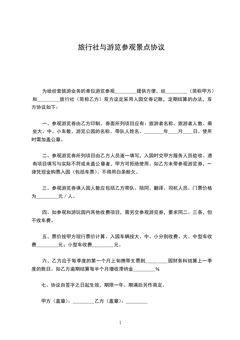 为给经营旅游业务的单位游览参观_________提供方便,经_________(简称甲方)和_________旅行社(简称乙方)双方议定采用人园交券记账,定期结算的办法,双方协议如下: