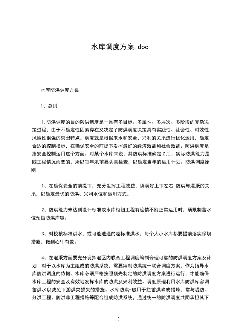 1.防洪调度的目的防洪调度是一具有多目标、多属性、多层次、多阶段的复杂决策过程,由于不确定性因素存在又决定了防洪调度决策具有实践性、社会性、时效性、风险性很强的突岀特点。调度就是根据来水和安全、兴利的关系进行优化运用,确定合适的控制指标,在确保安全的前提下发挥最好的经济效益和社会效益。防洪调度是指安全控制运用这个方面。对某个水库来说,其防洪标准确定Z后,实际防洪能力是随工程情况而变的,所以每年汛前要认真检查,以确定当年的运用计划。防洪调度原则