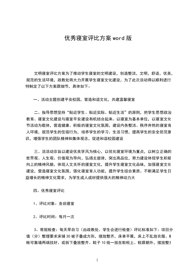 文明寝室评比方案为了推动学生寝室的文明建设,创造整洁,文明,舒适,优美,规范的生活环境,政教处将大力开展学生寝室文化建设,为了此次活动得以顺利进行,特制定了以下方案跟细节,具体如下: