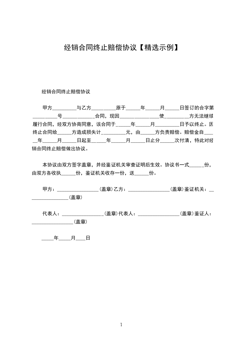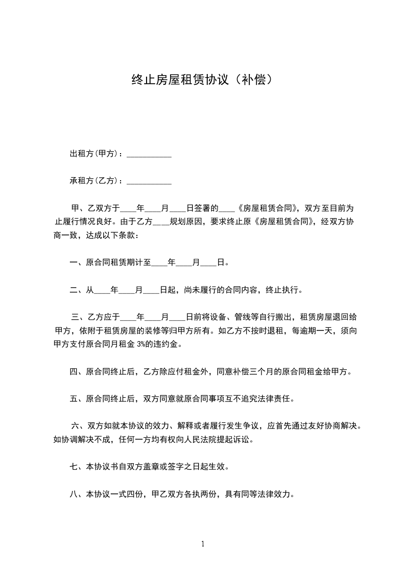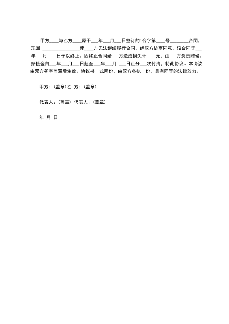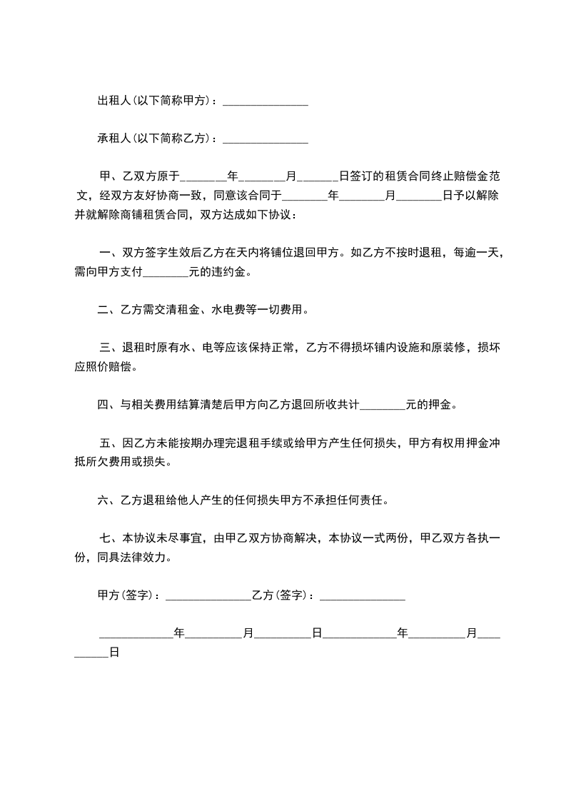 甲、乙双方原于________年________月_______日签订的租赁合同终止赔偿金范文,经双方友好协商一致,同意该合同于________年________月________日予以解除。并就解除商铺租赁合同,双方达成如下协议: