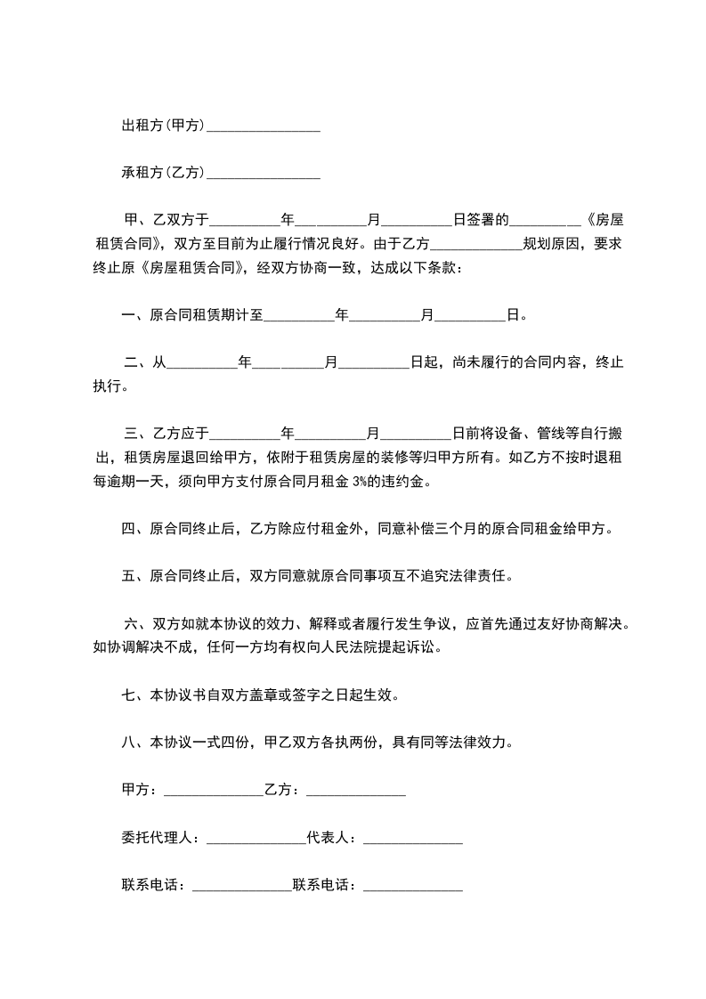 兹因甲方基于北京市大兴区__________村拆迁。现乙方终止_______________年_______________月_______________日与甲方所签,标的物坐落于_______________县市_______________市镇乡区_______________里(村)_______________邻_______________路(街)_______________段_______________?鹞___________巷_______________弄_______________号楼楼顶或屋凸之空间之租赁契约。双方同意除原租约中有关终止租约、权利担保及管辖法院等条文仍有效外,余悉依下列协议履行: