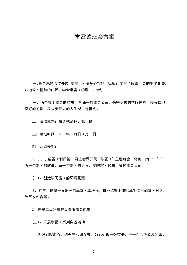 (一)、了解雷X利用第一周班会课开展“学雷X”主题班会,做到“四个一”即听一个雷X的故事、背一句雷X的名言、学唱雷X歌曲、摘抄雷X日记。