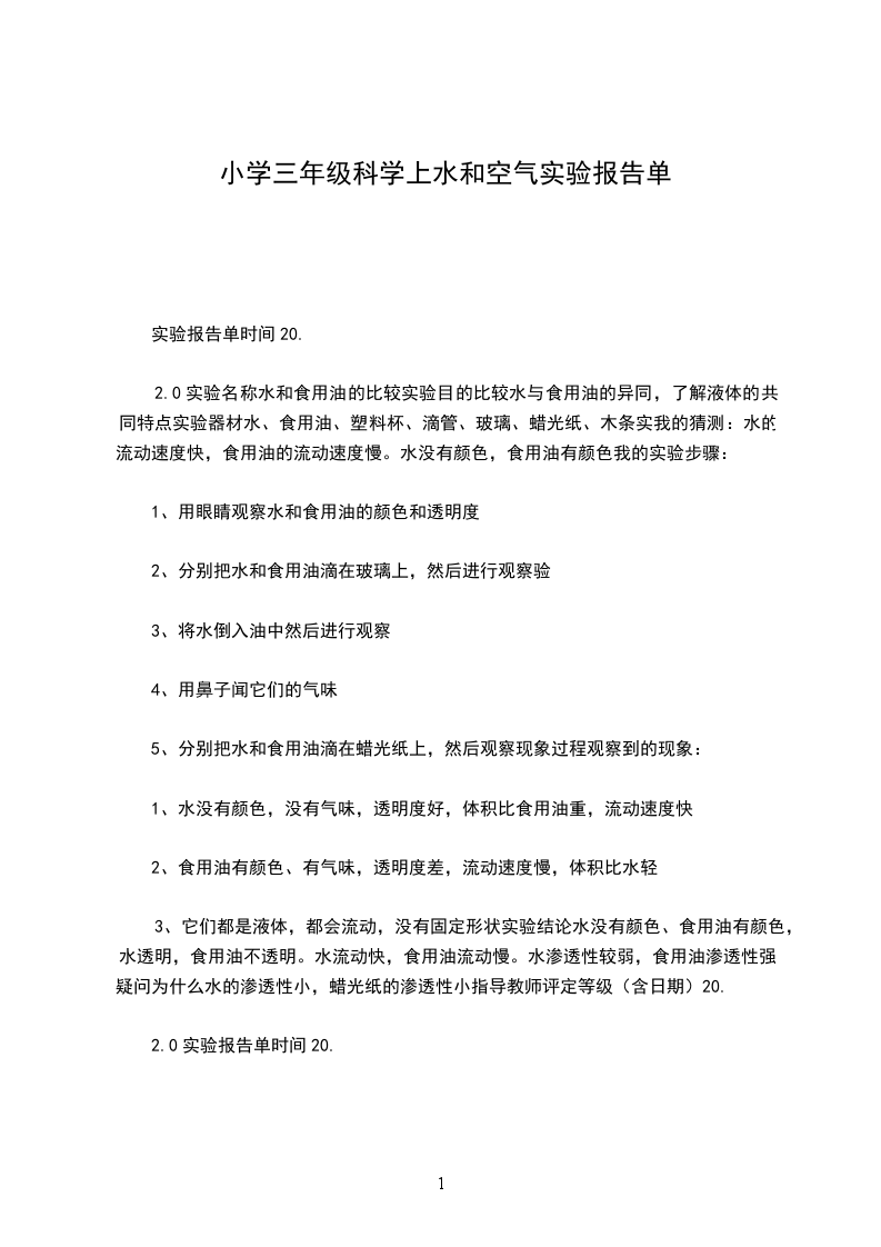 2.0实验名称水和食用油的比较实验目的比较水与食用油的异同,了解液体的共同特点实验器材水、食用油、塑料杯、滴管、玻璃、蜡光纸、木条实我的猜测:水的流动速度快,食用油的流动速度慢。水没有颜色,食用油有颜色我的实验步骤: