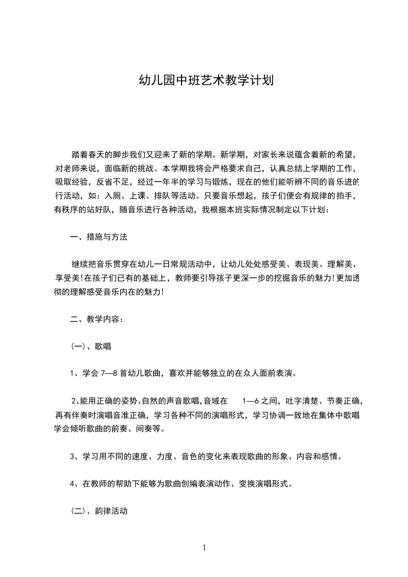 一、班况分析我班孩子喜欢唱歌、跳舞,能用自然、正确的声音唱出自己熟悉的歌曲,还能随音乐做简单的舞蹈动作,能感受二拍子和三拍子歌曲的不同节拍感觉。孩子们认识简单的乐器,如碰铃、铃鼓,并能在老师的引导下初步进行演奏,但大部分孩子不能集中看指挥,按指挥进行演奏。孩子们能认真欣赏绘画作品,能在欣赏过程中形成和表达自己的看法,大部分能认识和区分颜色,能画出简单的图画,但孩子们在操作过程中,持续的时间不长,还有部分年龄偏小的幼儿不能很好的区分颜色,也不能按老师的要求进行绘画。根据幼儿的情况,制定了以下计划:二、教学目标:1、学习使用不同的速度、力度、音色变化表现歌曲的不同形象、内容与情感,感受和表现二拍子歌曲的不同节拍感觉,学会在歌唱过程中等待和正确地表现出歌曲的前奏、间奏和尾奏;学习自然地与他人接唱和对唱,体验在歌唱活动中进行交流、合作的快乐。