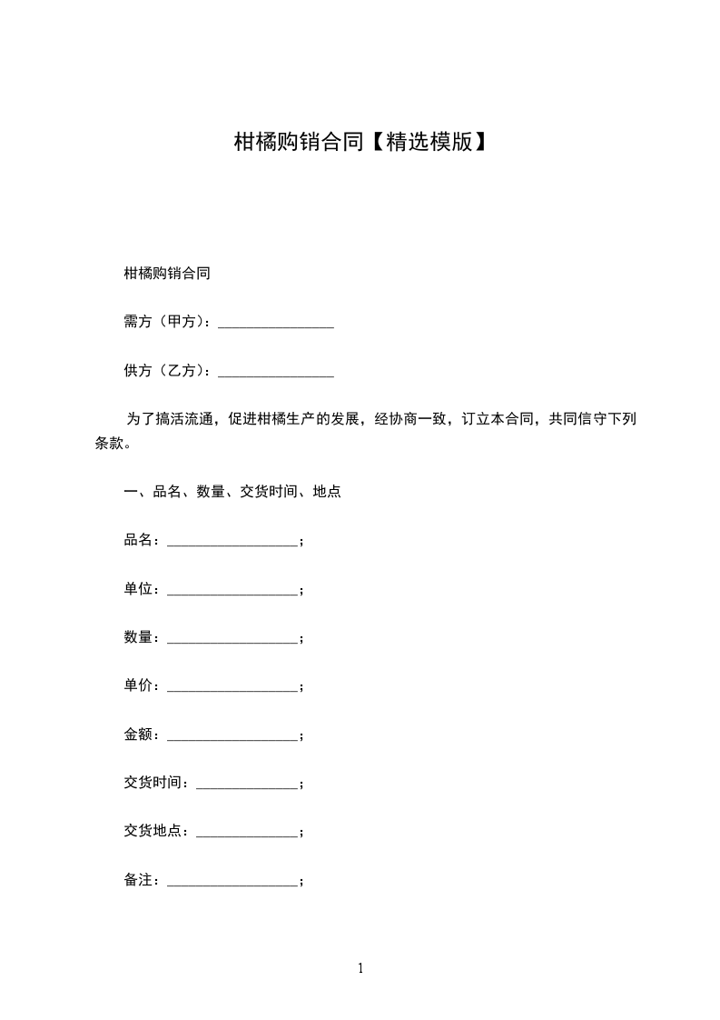 需方(甲方):_法定代表人:_供方(乙方):_法定代表人:_为了搞活流通,促进柑桔生产的发展,经协商一致,订立本合同。