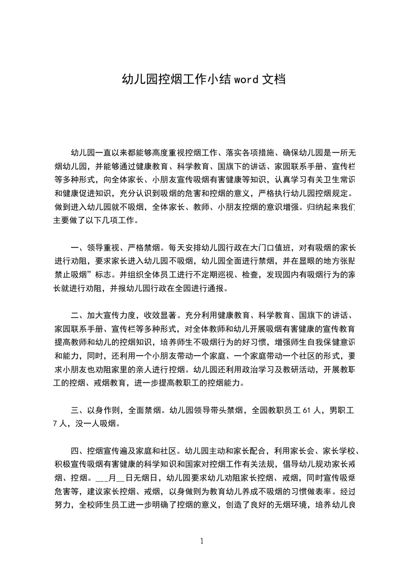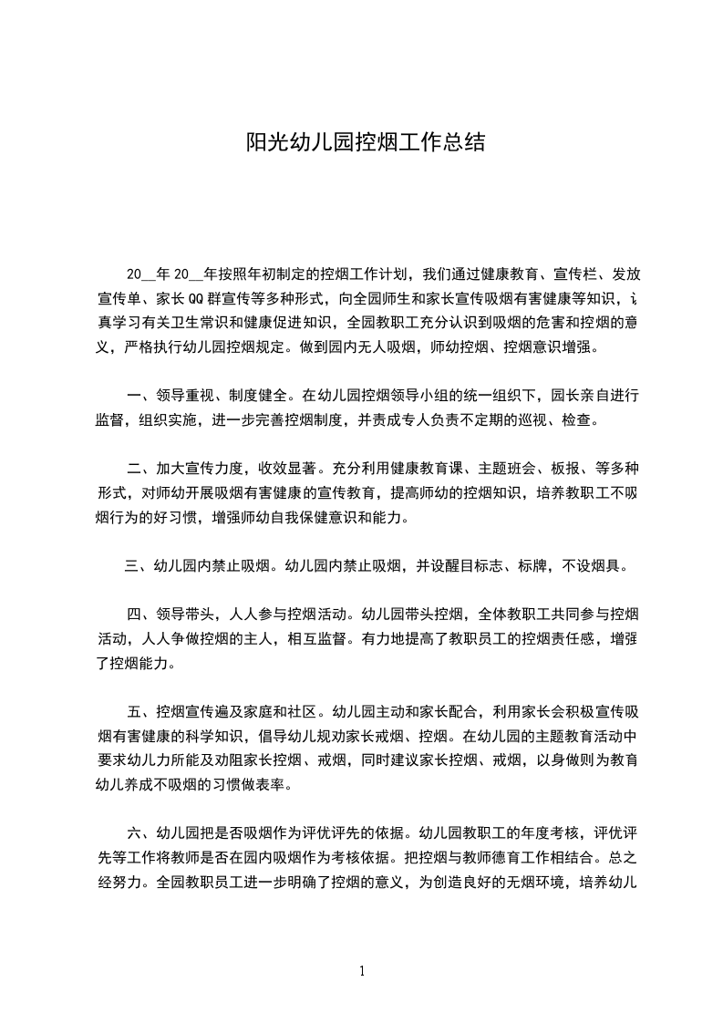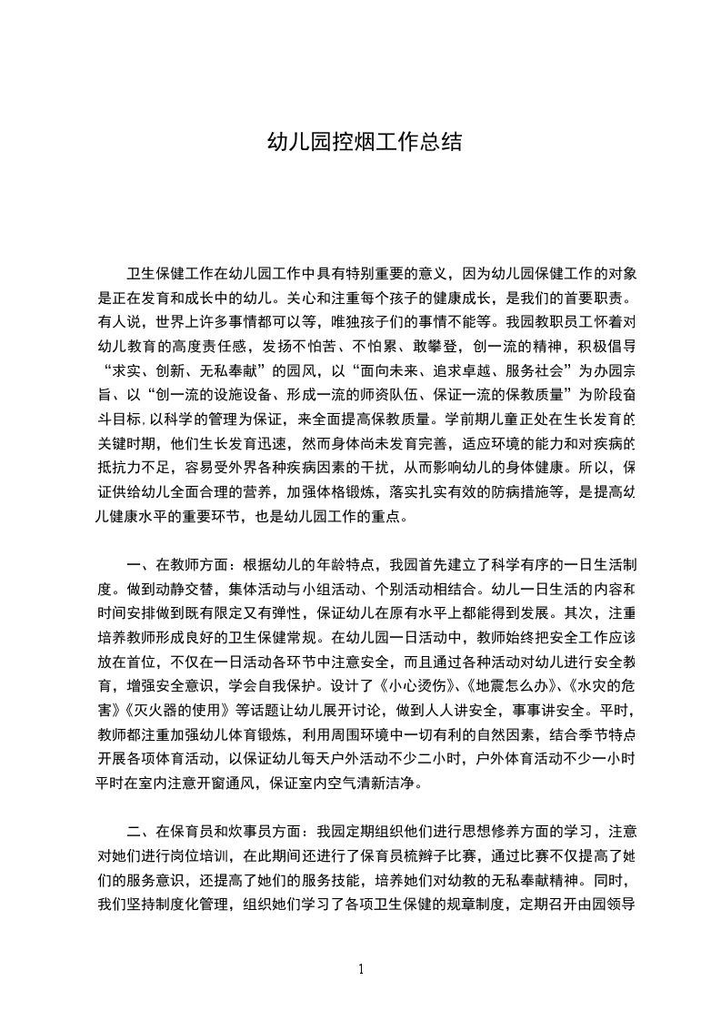 四、控烟宣传遍及家庭和社区。幼儿园主动和家长配合,利用家长会、家长学校、积极宣传吸烟有害健康的科学知识和国家对控烟工作有关法规,倡导幼儿规劝家长戒烟、控烟。___月__日无烟日,幼儿园要求幼儿劝阻家长控烟、戒烟,同时宣传吸烟危害等,建议家长控烟、戒烟,以身做则为教育幼儿养成不吸烟的习惯做表率。经过努力,全校师生员工进一步明确了控烟的意义,创造了良好的无烟环境,培养幼儿良好的健康习惯。下一步我园将继续作好控烟工作,让我园继续成为一所名符其实的“无烟学校”。