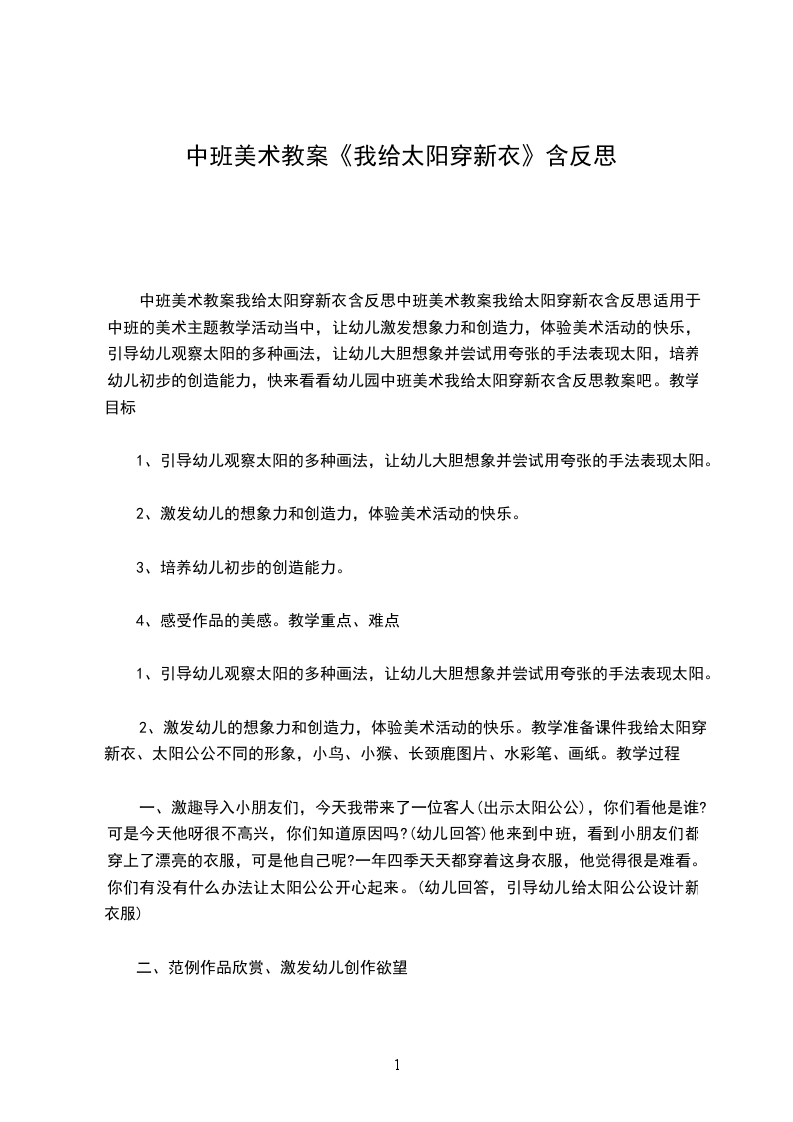 5、教师小结活动反思孩子们对太阳是比较熟识的了,在我出示太阳公公的时候孩子们能够一眼就认出来,但是由于对太阳公公的表情特征我没有很好地体现出来,因此在提问的时候有部分幼儿没有说出太阳公公不快乐的心情,在我提出太阳公公因为没有好看的衣服而不快乐的时候,部分孩子没有很好地倾听和理解,因此并没有向着预设的方向为太阳公公设计新衣服方面来,在这样的状况下,我只有直接提出为太阳公公设计新的衣服让他快乐,引出了本节所学内容。在出示示范画的时候,孩子们表现出的兴趣还是很大的,他们能够观看出太阳发生的不同变化。请孩子们为太阳公公设计新衣服是本节课的重点,在绘画的过程中,大部分孩子能够大胆作画,发挥想象力,画出和平常不一样的太阳,目标基本完成,在展示环节,由于部分幼儿没有完成作品,因此没有去好好观赏本班幼儿完成的作品,导致在进行评价的时候,没有按要求去点评。总的来说,本节课的目标基本完成,但是孩子们的想象力和创造力没有得到很好地激发,大部分还只是在模仿,绘画水平还有待于提高。