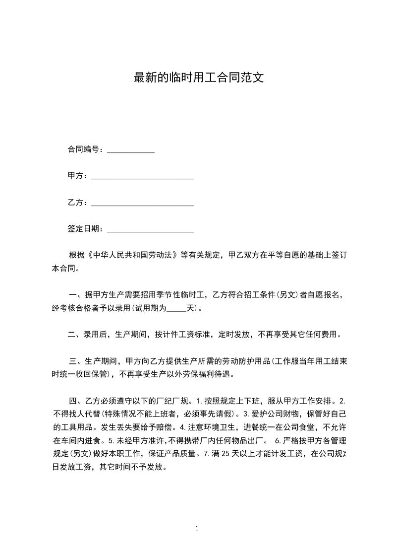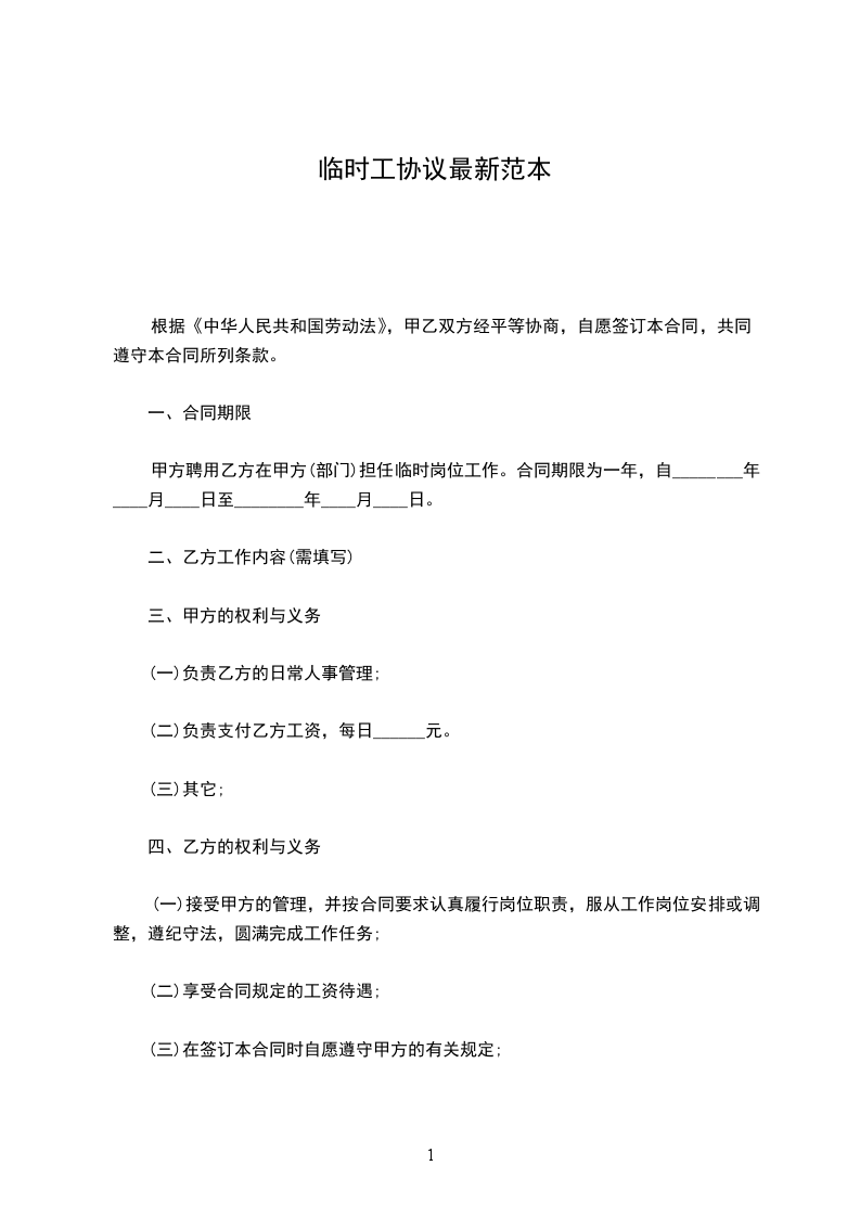甲方聘用乙方在甲方(部门)担任临时岗位工作。合同期限为一年,自________年________月________日至________年________月________日。