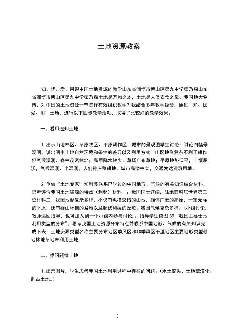 知、忧、爱、用谈中国土地资源的教学山东省淄博市博山区第九中学翟乃森山东省淄博市博山区第九中学翟乃森土地是万物之本,土地是人类衣食之母。我国地大物博,对中国的土地资源一节怎样有效组织教学?我结合多年教学经验,通过“知、忧、爱、用”土地,进行以下四步教学活动,取得了比较好的教学效果。