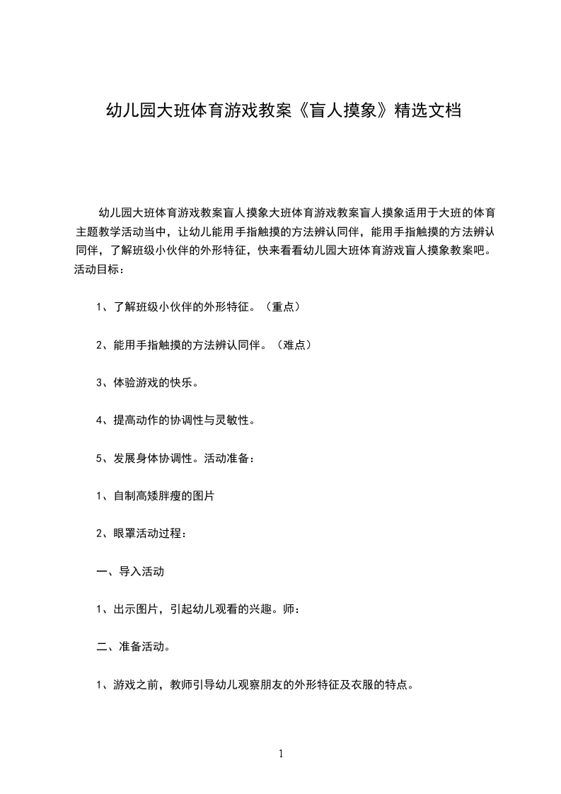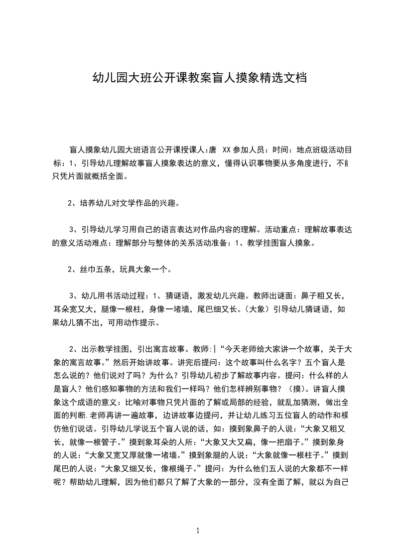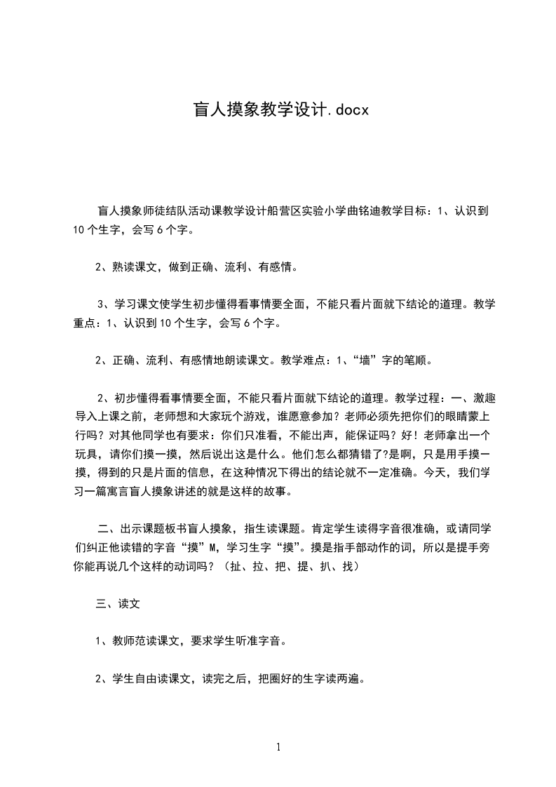 2、初步懂得看事情要全面,不能只看片面就下结论的道理。教学过程:一、激趣导入上课之前,老师想和大家玩个游戏,谁愿意参加?老师必须先把你们的眼睛蒙上,行吗?对其他同学也有要求:你们只准看,不能出声,能保证吗?好!老师拿出一个玩具,请你们摸一摸,然后说出这是什么。他们怎么都猜错了?是啊,只是用手摸一摸,得到的只是片面的信息,在这种情况下得出的结论就不一定准确。今天,我们学习一篇寓言盲人摸象讲述的就是这样的故事。
