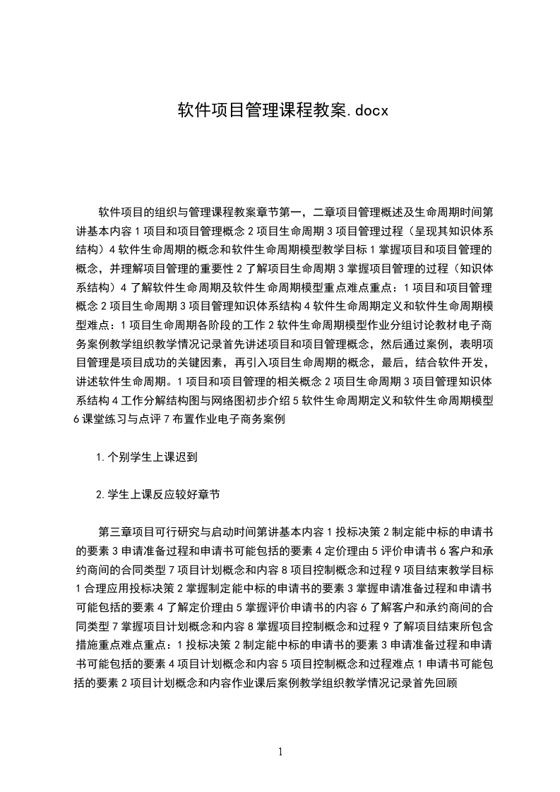 软件项目的组织与管理课程教案章节第一,二章项目管理概述及生命周期时间第讲基本内容1项目和项目管理概念2项目生命周期3项目管理过程(呈现其知识体系结构)4软件生命周期的概念和软件生命周期模型教学目标1掌握项目和项目管理的概念,并理解项目管理的重要性2了解项目生命周期3掌握项目管理的过程(知识体系结构)4了解软件生命周期及软件生命周期模型重点难点重点:1项目和项目管理概念2项目生命周期3项目管理知识体系结构4软件生命周期定义和软件生命周期模型难点:1项目生命周期各阶段的工作2软件生命周期模型作业分组讨论教材电子商务案例教学组织教学情况记录首先讲述项目和项目管理概念,然后通过案例,表明项目管理是项目成功的关键因素,再引入项目生命周期的概念,最后,结合软件开发,讲述软件生命周期。1项目和项目管理的相关概念2项目生命周期3项目管理知识体系结构4工作分解结构图与网络图初步介绍5软件生命周期定义和软件生命周期模型6课堂练习与点评7布置作业电子商务案例
