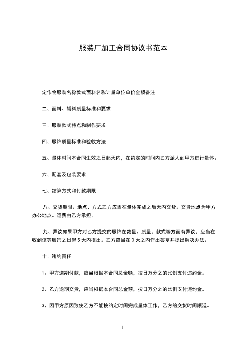 五、量体时间本合同生效之日起天内,在约定的时间内乙方派人到甲方进行量体。