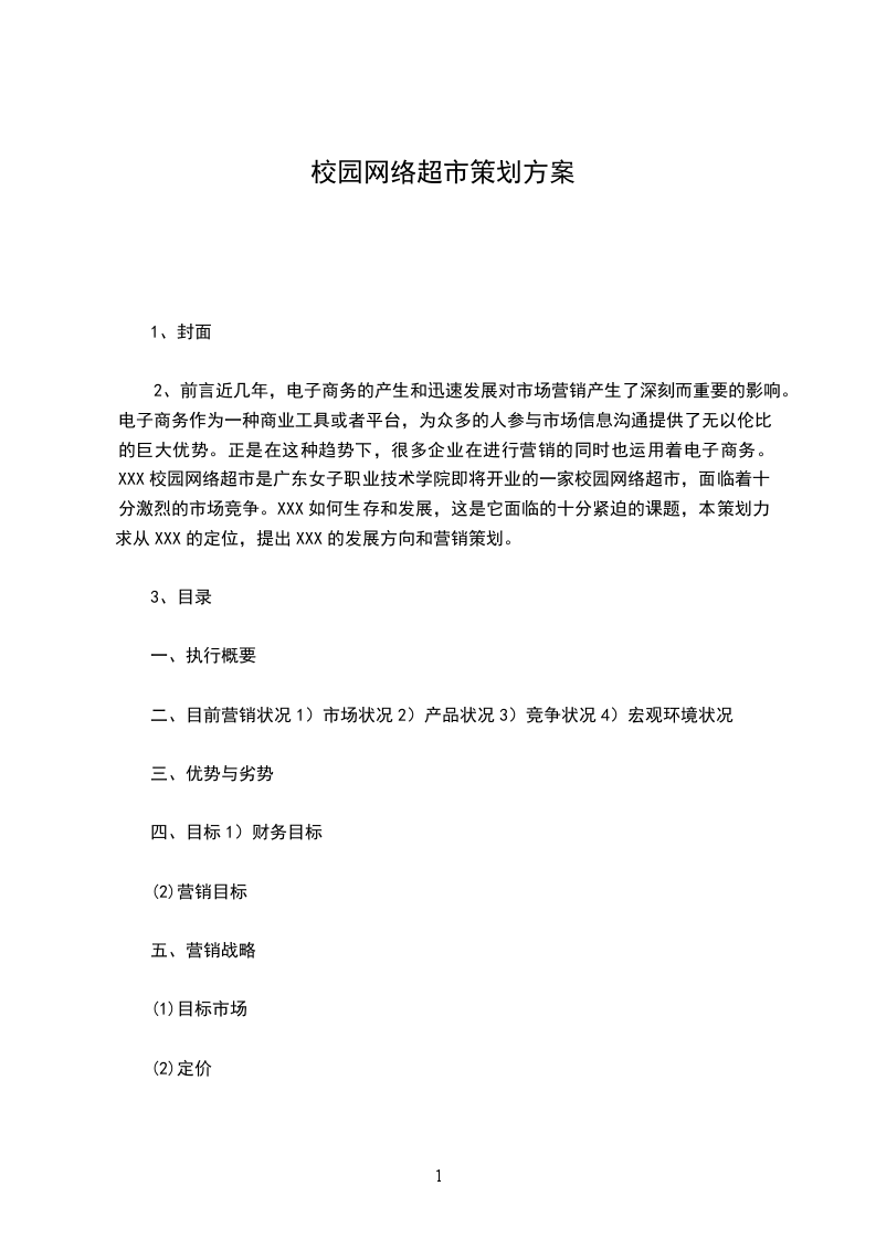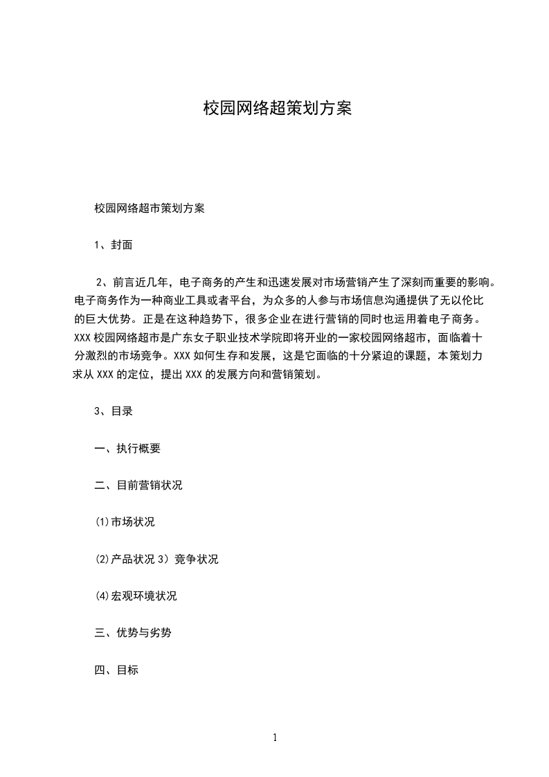 2、前言近几年,电子商务的产生和迅速发展对市场营销产生了深刻而重要的影响。电子商务作为一种商业工具或者平台,为众多的人参与市场信息沟通提供了无以伦比的巨大优势。正是在这种趋势下,很多企业在进行营销的同时也运用着电子商务。XXX校园网络超市是广东女子职业技术学院即将开业的一家校园网络超市,面临着十分激烈的市场竞争。XXX如何生存和发展,这是它面临的十分紧迫的课题,本策划力求从XXX的定位,提出XXX的发展方向和营销策划。