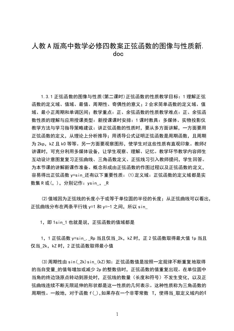 1.3.1正弦函数的图像与性质(第二课时)正弦函数的性质教学目标:1理解正弦函数的定义域、值域、最值、周期性、奇偶性的意义;2会求简单函数的定义域、值域、最小正周期和单调区间;教学重点:正、余弦函数的性质教学难点:正、余弦函数性质的理解与应用授课类型:新授课课时安排:1课时教具:多媒体、实物投影仪教学方法与学习指导策略建议:讲正弦函数的性质时,要从多方面讲解,一方面要用正弦函数的定义,从理论上分析推导;用诱导公式证明正弦函数是周期函数,且周期为2kp,kZ且k0等等。另一方面要观察图形,使学生对这些性质有直观印象。教师在讲课时,可充分利用多媒体设备,让学生观察、理解、记忆。教学环节教学内容师生互动设计意图复复习正弦曲线、三角函数定义、正弦线习引入教师提问,学生回答。为本节课的讲解新课作准备。概念形成由正弦函数的作图过程以及正弦函数的定义,容易得出正弦函数y=sin_还有以下重要性质:(1)定义域:正弦函数的定义域都是实数集R或(,),分别记作:ysin_,_R