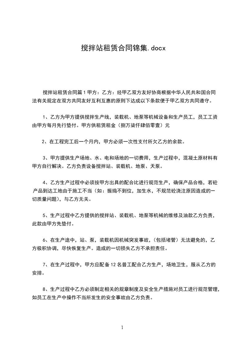 搅拌站租赁合同篇1甲方:乙方:经甲乙双方友好协商根据中华人民共和国合同法有关规定在双方共同友好互利互惠的原则下达成以下条款便于甲乙双方共同遵守。