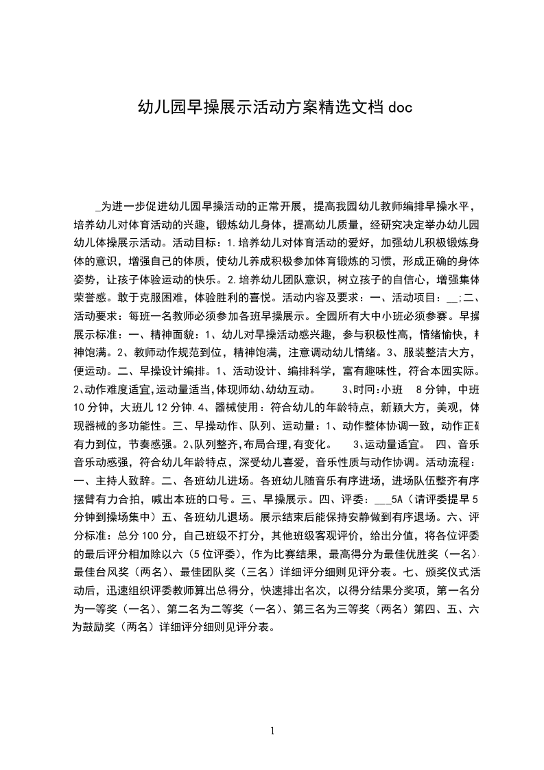 二、幼儿园早操目标制定具体:内容丰富,形式多变。体现“活”!根据幼儿的年龄特征及动作发展情况的早操编排上,除了基本操节外,还包括:变换队型、舞蹈、游戏,放松整理等环节。游戏内容充分体现健康性、季节性、独创性。形式上求多变,队型采取集体、小组、自由组合等多种形式。