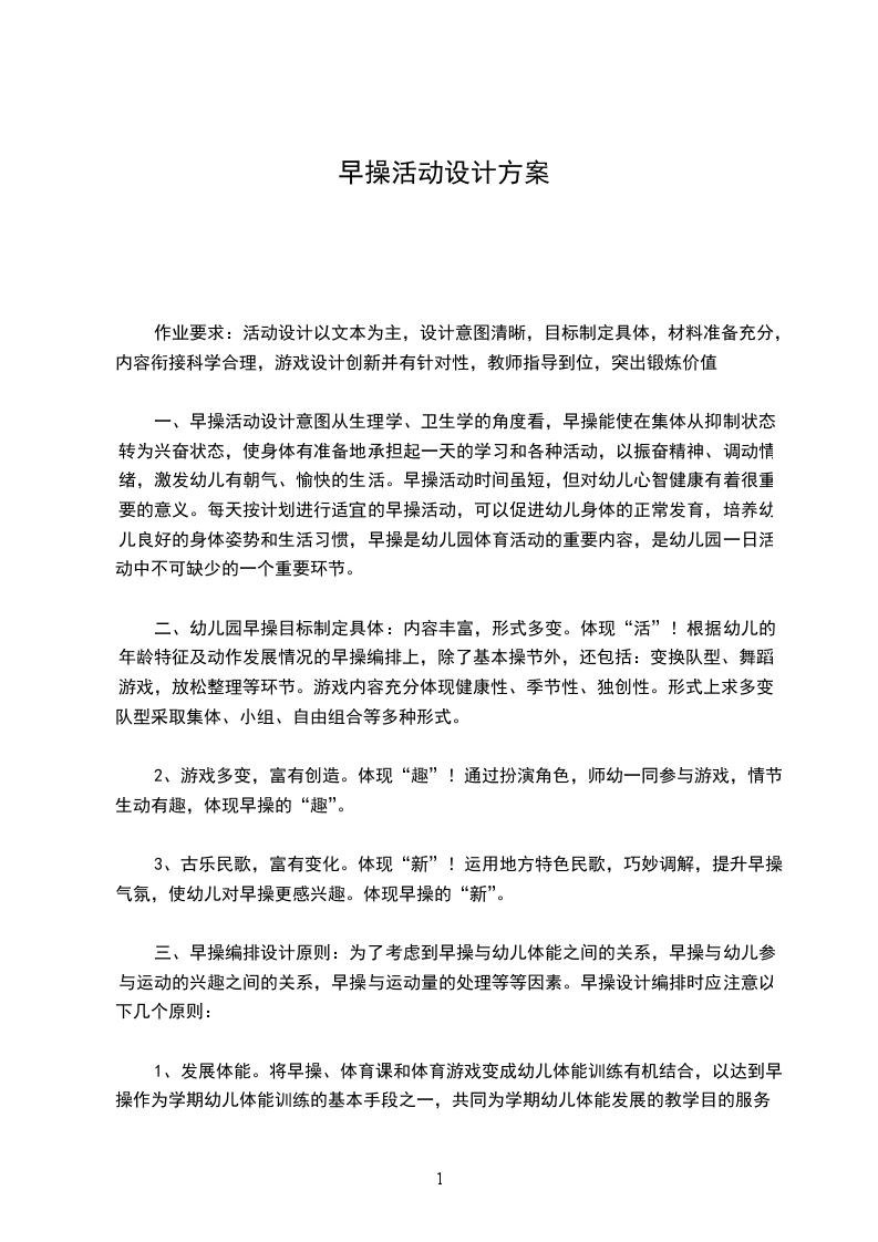 作业要求:活动设计以文本为主,设计意图清晰,目标制定具体,材料准备充分,内容衔接科学合理,游戏设计创新并有针对性,教师指导到位,突出锻炼价值