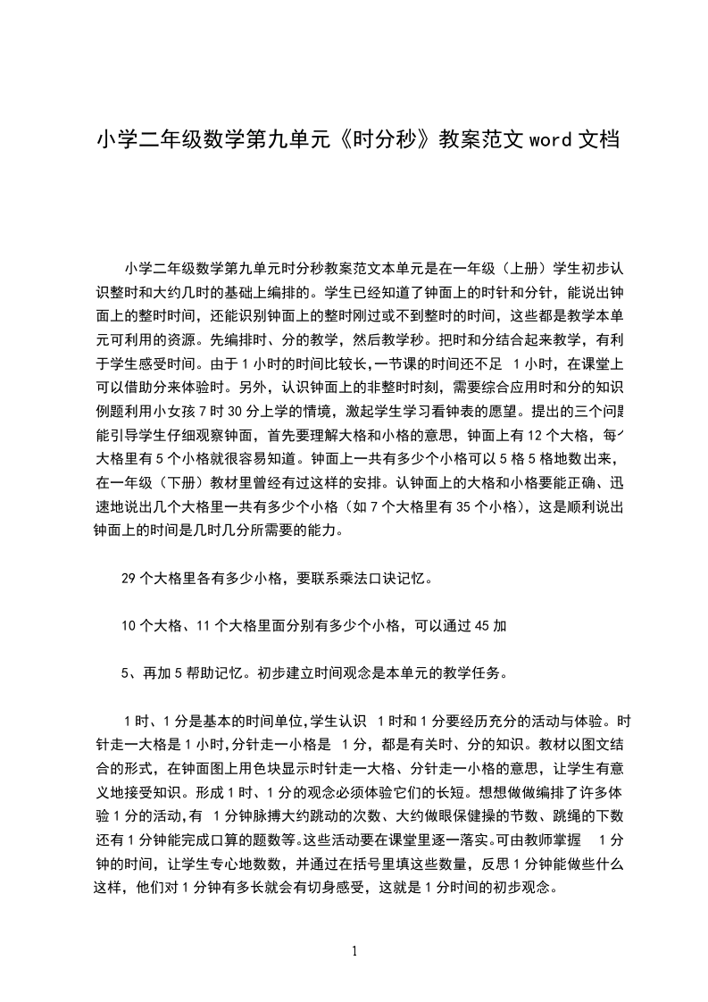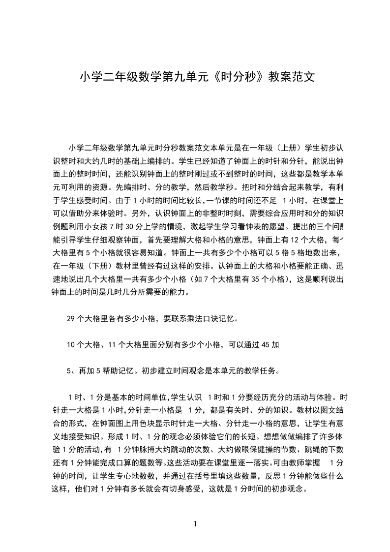 小学二年级数学第九单元时分秒教案范文本单元是在一年级(上册)学生初步认识整时和大约几时的基础上编排的。学生已经知道了钟面上的时针和分针,能说出钟面上的整时时间,还能识别钟面上的整时刚过或不到整时的时间,这些都是教学本单元可利用的资源。先编排时、分的教学,然后教学秒。把时和分结合起来教学,有利于学生感受时间。由于1小时的时间比较长,一节课的时间还不足1小时,在课堂上可以借助分来体验时。另外,认识钟面上的非整时时刻,需要综合应用时和分的知识。例题利用小女孩7时30分上学的情境,激起学生学习看钟表的愿望。提出的三个问题能引导学生仔细观察钟面,首先要理解大格和小格的意思,钟面上有12个大格,每个大格里有5个小格就很容易知道。钟面上一共有多少个小格可以5格5格地数出来,在一年级(下册)教材里曾经有过这样的安排。认钟面上的大格和小格要能正确、迅速地说出几个大格里一共有多少个小格(如7个大格里有35个小格),这是顺利说出钟面上的时间是几时几分所需要的能力。