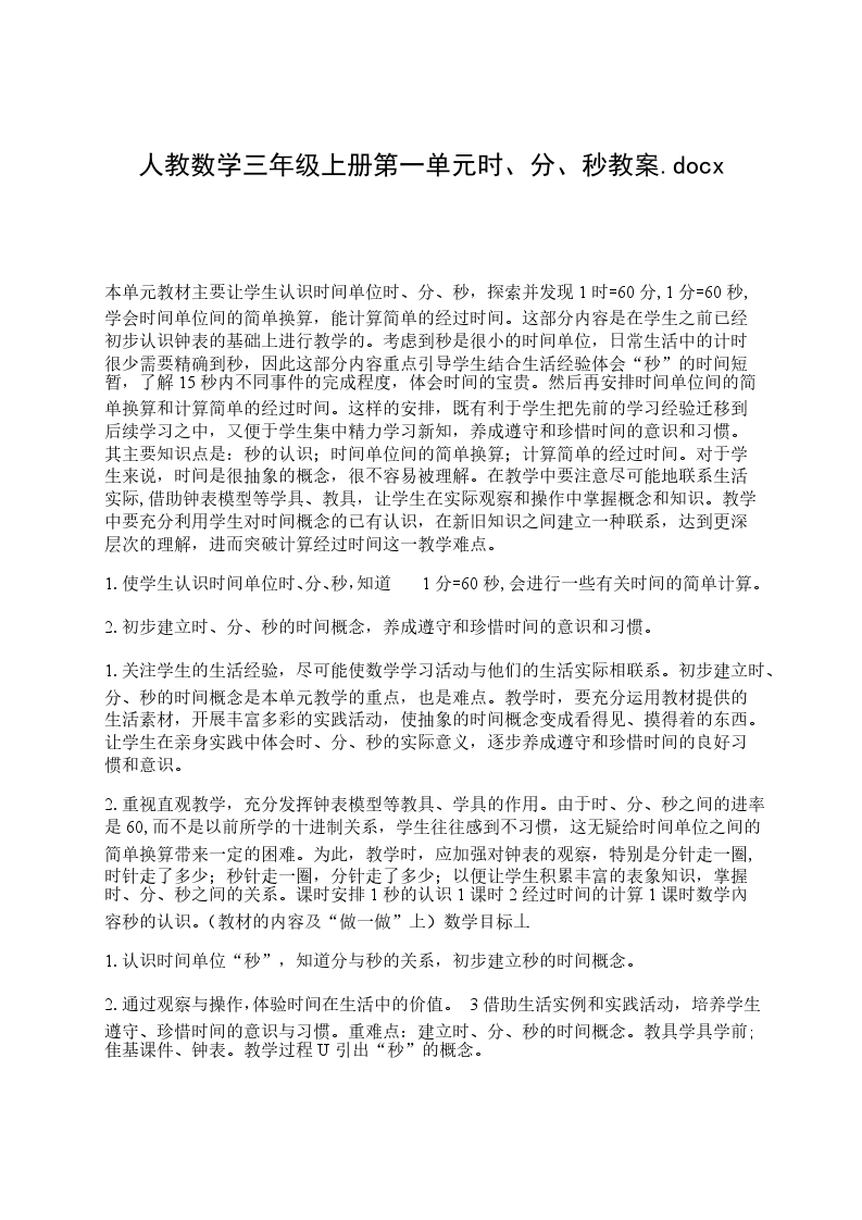 1小时比较长,在一节课上无法直接体验。为此,教材设计了两条体验1小时的途径:是利用时、分的进率,从对1分的感受联想60分会有多长,体验1小时有多长;另一条是想想做做第3题,通过一节课的时间加一次课间休息时间,再加上若干分钟正好是1小时来体验。由于学生对一节课和一次课间休息的时间是有感受的,因此能间接地体会1小时有多长。关于时、分间的进率,要通过拨钟让学生发现。教材的安排是拨分针,让分针走60个小格,看时针同时走了几大格。通过分针走60小格(即60分),时针刚好走1大格(1时),推理得到1时=60分。想想做做第4题说出时针从12走到另一个数的位置上是多少时间,为下面认读钟面时间作铺垫。在学生已能认读钟面上整时时间的基础上,例题教学认读非整时时间。第一个钟面,教学怎样看时间以及怎样读、写钟面上的时间。出现8时零5分的钟面,学生联系已有经验能看到这个时间是大约8时,是8时刚过。钟面上的一个扇形色块,有助于学生看出分针的位置是从12起走了5小格,钟面上的时间是8时过5分。教材告诉学生,这个时间要说成8时零5分,可以写作8:05。可见,首次认读钟面上的非整时时间是以大约几时为起始,经历几时刚过几时过多少分规范地读、写时间的过程,有意义地接受读、写钟面上时间的方法。例题中认识第二个钟面上的时间是教学难点。由于时针非常接近4,学生往往误读成4时55分。教学时首先要明白这个时间是快到4时,进而看出4时少5分。然后利用钟面上的扇形色块,帮助学生理解4时少5分也就是3时过55分。这里的55分可以从11个大格是55个小格得出,也可以通过60小格减5小格算得。可见,解决难点要正确辨认钟面上的时间是4时少5分,并把它转化为3时过55分。想想做做第1、2题都是认读时间的练习,教材作出由易到难的安排。第一个钟面上的分针在126的范围内;第二个钟面是分针走过6以后的时间;第三个钟面是分针接近12,且未到12的时间。每个钟面都用扇形色块帮助理解分针从12起走了多少个小格,从而正确认读时间。第四个钟面是分针刚过12的时间,隐含了可以与第三个钟面进行比较的内容。在学生认读钟面时间的时候,要习惯这样想:这个时间是几时过了多少分。尤其要把快到几时或几时还不到转化成几时过多少分,这样才能避免认读错误。另外,第1题还练习写出钟面上时间的方法,第2题培养认读各种钟、表面上时间的能力。想想做做第3、4题把认读钟面时间的练习与日常生活相联系,感受在校的作息时间都是固定的,每天的起床、睡觉时间也应该有规律地合理安排。第4题认读左起第二个钟面的时间可能是难点,不仅由于这个时间是9时不到,而且时针与分针十分靠近。要坚持原有的认读时间的思路和方法。第5、6题变换认读时间的练习形式,通过给钟面画分针和在钟面上拨出指定的时间,维持学习热情,进一步掌握认读时间的方法。在认识时、分之后教学秒,一方面增加有关时间的知识,另一方面通过秒更好地体验分。例题把认识秒分成三步进行:首先在跑100米的情境中引出秒,感受计量不到1分的时间需要使用秒,秒是比分更小的时间单位;接着结合钟面图介绍秒针,用最长最细等词语形象地描述,使学生很快地认识秒针;最后利用钟面上1小格的扇形色块,理解秒针走1小格的时间是1秒。想想做做第14题都是感受秒的活动。看着钟面上秒针的走动,每秒拍一下手,通过有节奏地拍手,不但感受1秒是多长,还感受时间_秒1秒地过去的。用接近60秒的时间从1数到60,是不看钟面上的秒针,默默地体验时间,既能体验1秒的时间,也能体验1分的时间。了解自己做一次深呼吸、跳20下绳、从教室前面走到后面的时间,以及30秒时间能背几句乘法口诀,也是在活动中感受秒。这些活动要合作进行,在做各项活动的时候,可请同伴帮助计时。另外,在积极参与活动的同时,要尽量保持安静,因为体验时间需要安静的环境和平稳的心态。秒与分之间的进率是学生在钟面上发现的。要先调整分针和秒针的位置,使它们都正好指着12,便于看出秒针走60小格的同时,分针走了1小格。电子钟的计时表示了几时几分几秒,在钟面上能看到时间1秒1秒地过去,再次体验了秒。在8时30分59秒以后,钟面时间变成8时31分0秒,让学生思考这个变化,能加强对60秒是1分的理解。想想做做第5题是全单元知识的综合练习,要联系时、分、秒的观念选择合适的时间单位。如果发生选错单位的现象,也要联系1时、1分、1秒有多长的体验纠正错误。如午睡1分钟、1秒钟够吗?又如25小时、25秒钟各是多长?吃饭需要25小时吗?25秒钟够吗?本单元不要求进行时、分、秒单位的换算,如3分是多少秒、4时是多少分等。因为学生不具备进行换算的计算能力。想想做做第6题是在感受时间长短的基础上进行的,因为5分的时间比5秒长,所以5分5秒;因为1时是60分,所以1时100分。