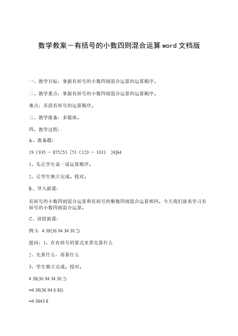 3.培养学生独立思考和从不同角度考虑问题的。教学重难点使学生掌握含有两级运算(含有小括号)的运算顺序,并能正确计算。教学工具件教学程