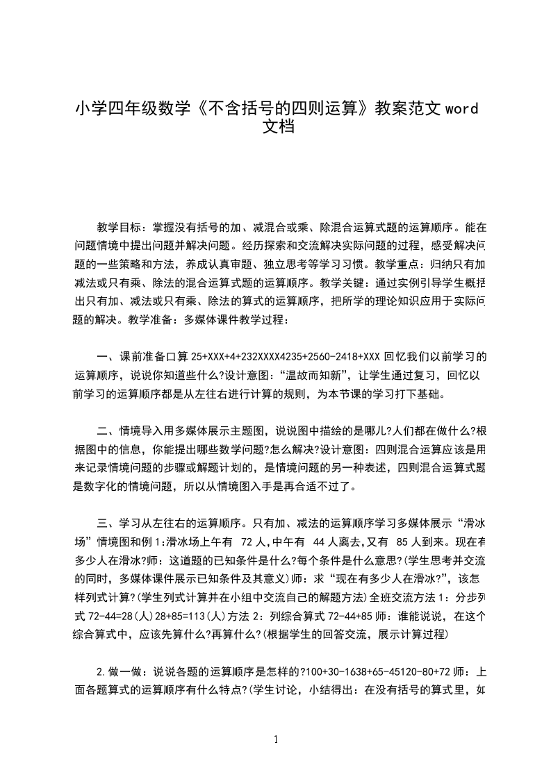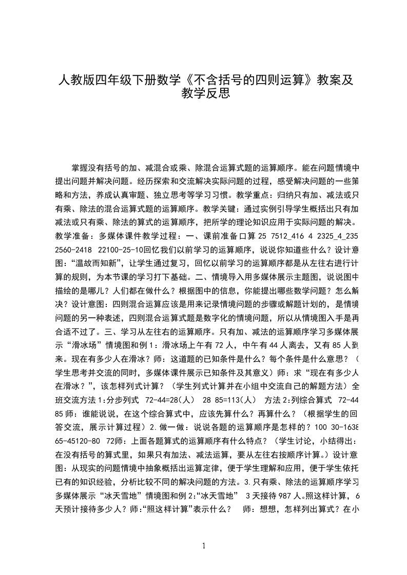 三、学习从左往右的运算顺序。只有加、减法的运算顺序学习多媒体展示“滑冰场”情境图和例1:滑冰场上午有72人,中午有44人离去,又有85人到来。现在有多少人在滑冰?师:这道题的已知条件是什么?每个条件是什么意思?(学生思考并交流的同时,多媒体课件展示已知条件及其意义)师:求“现在有多少人在滑冰?”,该怎样列式计算?(学生列式计算并在小组中交流自己的解题方法)全班交流方法1:分步列式72-44=28(人)28+85=113(人)方法2:列综合算式72-44+85师:谁能说说,在这个综合算式中,应该先算什么?再算什么?(根据学生的回答交流,展示计算过程)